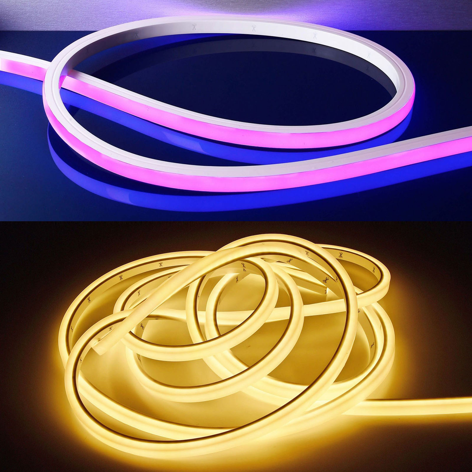 Si alimenta a 24V tramite alimentatore (non incluso) ed ha un'intensità luminosa di 3650 lumen per la versione luce calda 3000K, 1575 lumen per la versione RGB e 1600 per la versione RGBW+3000K luce calda. L'angolo di luce è di 180 gradi. Questa striscia è dotata di LED SMD di ultima generazione a basso consumo energetico ed ha la particolarità di emettere luce sulla parte superiore stile neon.