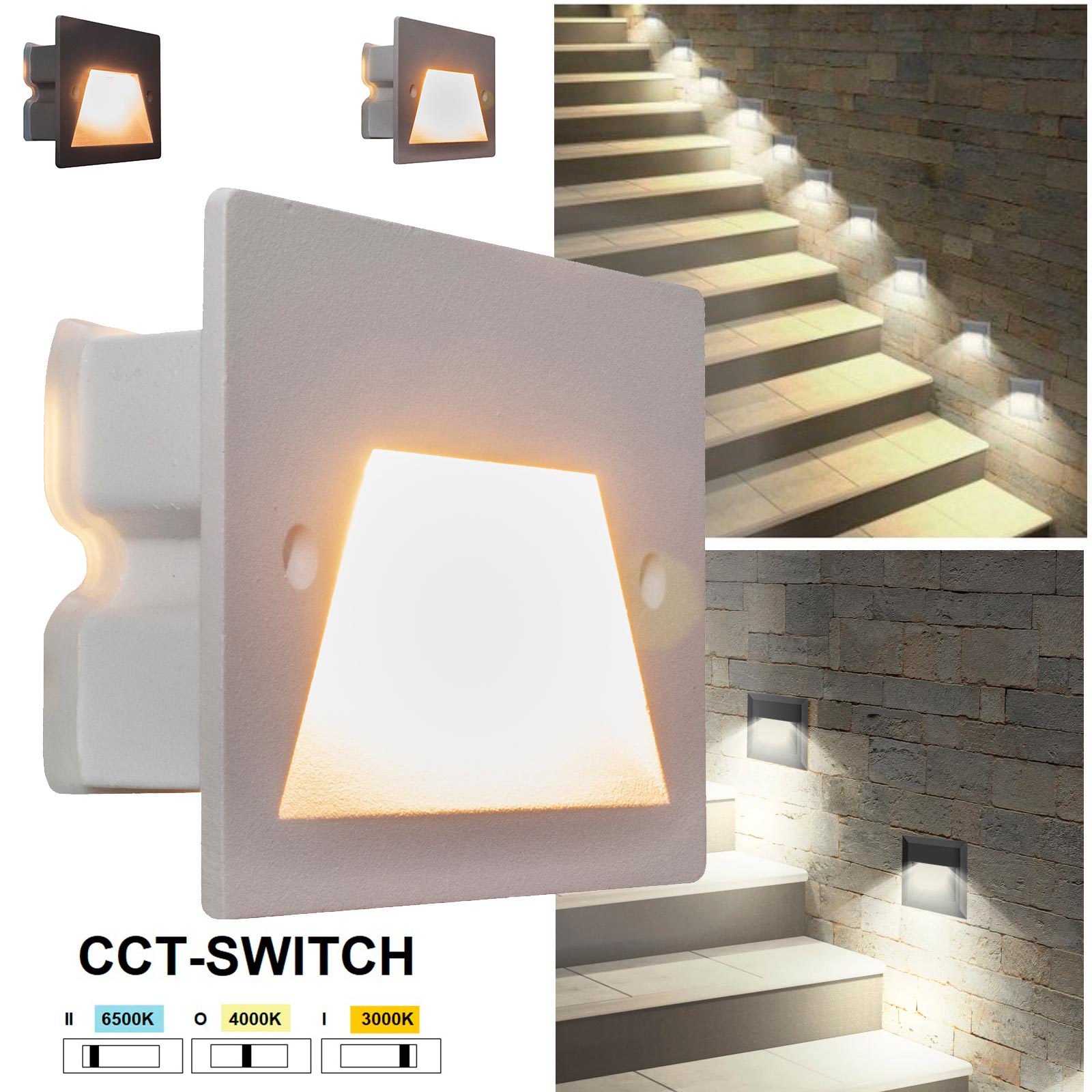 Faretto segnapassi a LED adatto per uso esterno ed interno per l'incasso a parete o muro in cassette 503 (3 posti) dotato di LED integrati con interruttore CCT per scegliere la temperatura di luce adatta all'ambienti. Il faretto ha una potenza di 3W ed è ideale per l'illuminazione esterna di giardini, viali, gradini, scalinate, gradini, per segnalare percorsi pedonali, come illuminazione da muro, all'esterno di balconi, terrazzi. Si installa facilmente in una cassaforma 503 (3 posti) ed ha un grado di protezione IP65 adatto a qualsiasi condizione atmosferica.