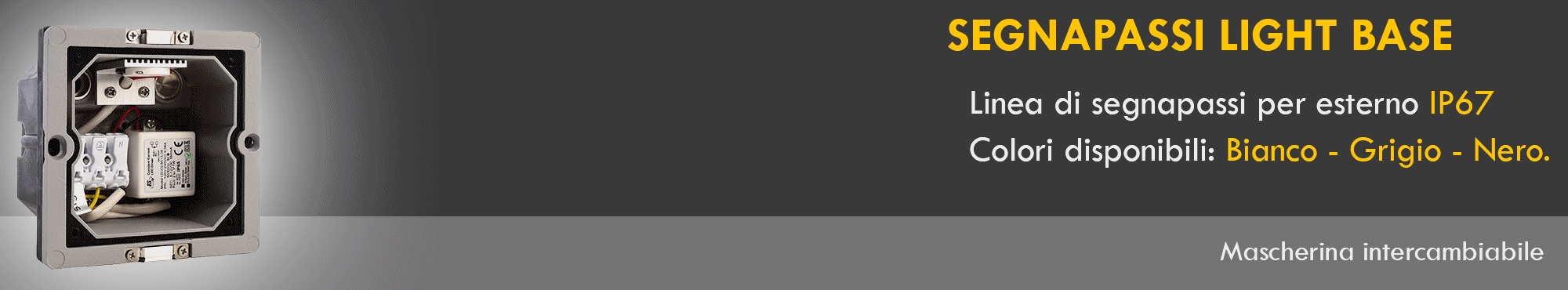 LIGHT BASE linea di segnapassi di forma quadrata dal design moderno con LED integrato adatti per l'incasso in muri e pareti per illuminare sentieri, vialetti, scalinate e pareti, all'esterno di giardini, abitazioni, negozi, per indicare percorsi pedonali. Grazie alla sorgente luminosa a LED da 1W di ultima generazione questo segnapassi ha un consumo energetico irrisorio.
