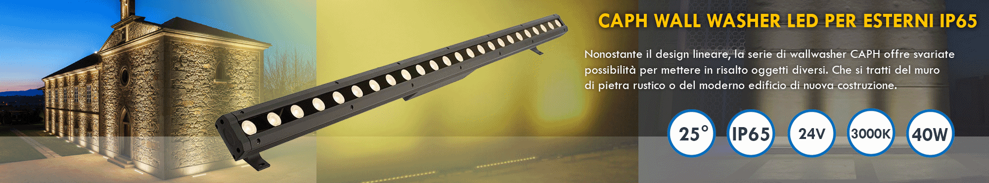 Questa barra è dotata di 24 LED SMD che generano una potenza di 40W con un'intensità luminosa di 2560 lumen / 3200 lumen adatta per l'illuminazione mirata di eleminti architettonici. Dotata di grado di protezione IP65 resistente alle intemperie e gli agenti atmosferici.