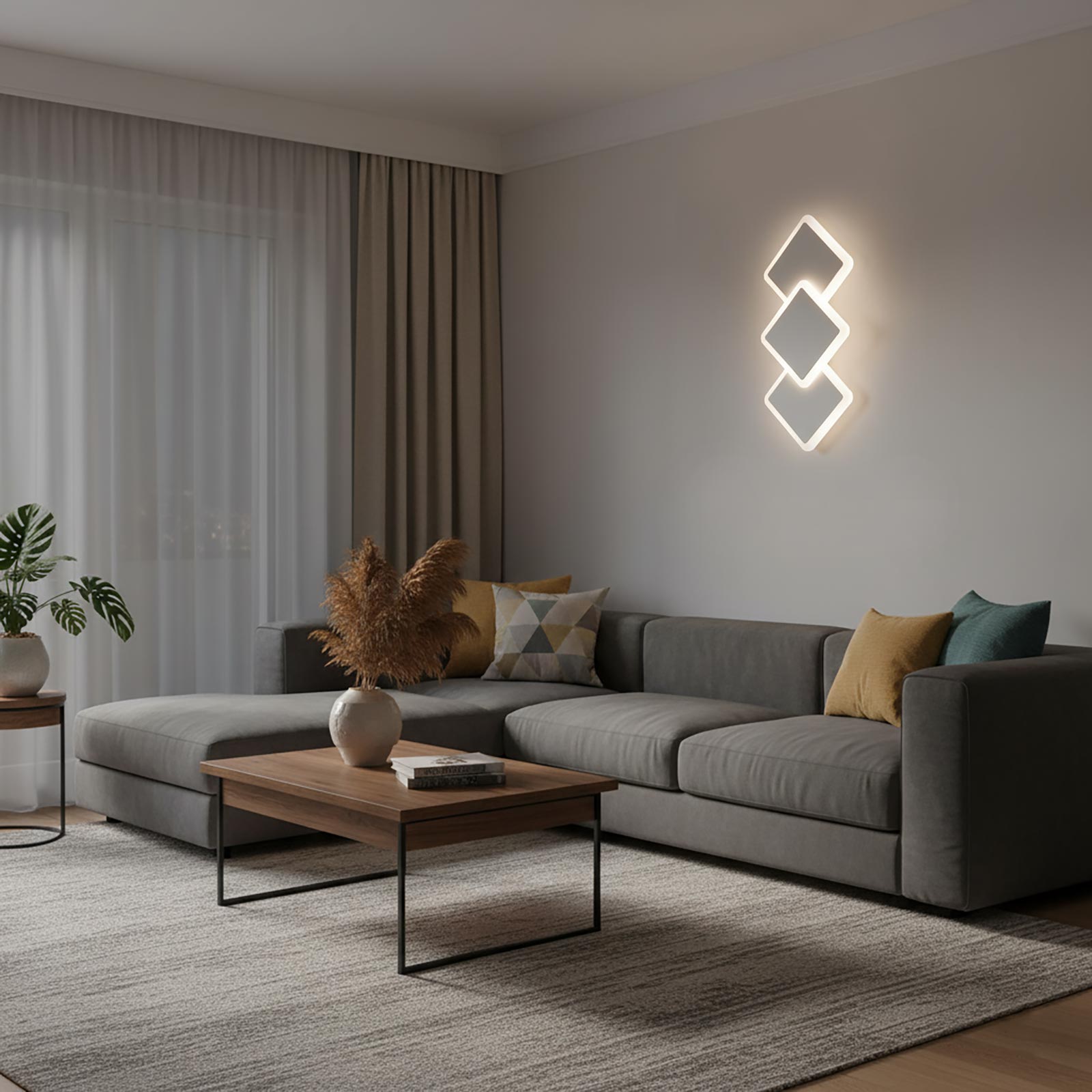 Applique moderno da parete con design decorativo a 3 rombi, ideale per illuminare ambienti interni come soggiorno, camera da letto, cucina, ingresso, ufficio. La struttura in alluminio bianco e il diffusore in acrilico opalino garantiscono una diffusione uniforme della luce, riducendo l’abbagliamento e creando un effetto luminoso piacevole e decorativo sulla parete. Il corpo compatto e il design geometrico rendono questa lampada LED da parete adatta a spazi moderni e contemporanei.