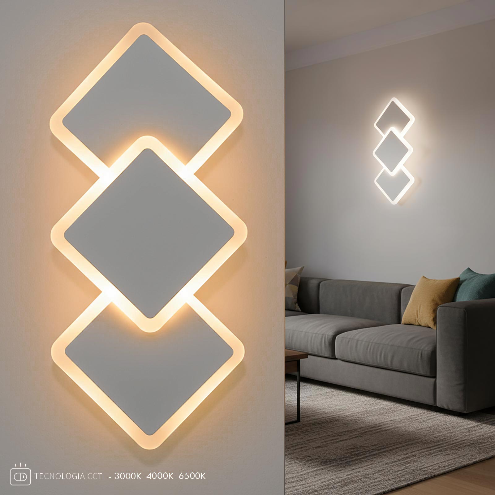 L’applique integra un modulo LED da 14W ad alta efficienza energetica, con una resa luminosa di 1120 lumen equivalenti a circa 112W delle tradizionali lampade alogene. È dotato di tecnologia CCT che permette di selezionare la temperatura di colore più adatta all’ambiente tramite un interruttore integrato sull’alimentatore. Le tre modalità di luce disponibili sono luce calda 3000K, luce naturale 4000K e luce fredda 6500K, per un’illuminazione personalizzabile in base all’atmosfera desiderata.