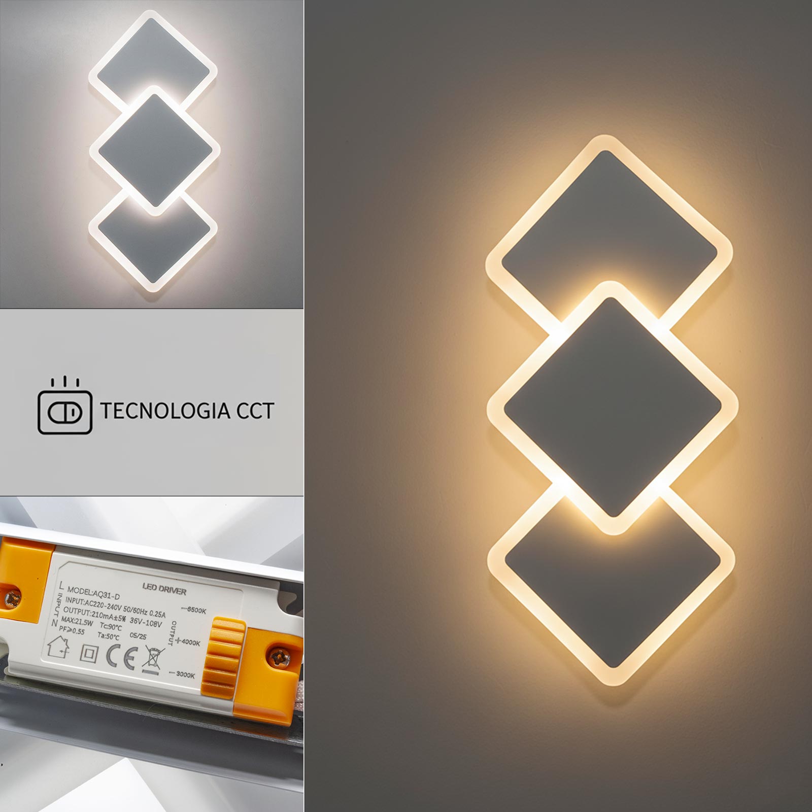 L’applique integra un modulo LED da 14W ad alta efficienza energetica, con una resa luminosa di 1120 lumen equivalenti a circa 112W delle tradizionali lampade alogene. È dotato di tecnologia CCT che permette di selezionare la temperatura di colore più adatta all’ambiente tramite un interruttore integrato sull’alimentatore. Le tre modalità di luce disponibili sono luce calda 3000K, luce naturale 4000K e luce fredda 6500K, per un’illuminazione personalizzabile in base all’atmosfera desiderata.