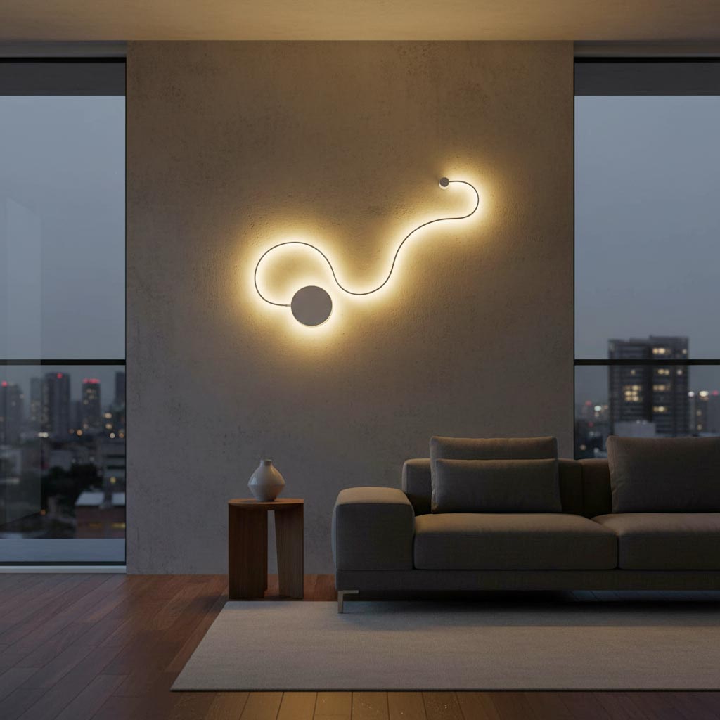 Lampada da parete dal design moderno dotata di LED da 20W con tecnologia CCT a basso consumo energetico, realizzata in alluminio di colore bianco ha la forma curva che richiama quella di un "serpente" ideale per l'illuminazione interna di camere da letto, soggiorno, salotti ma anche all'interno di negozi, attività commerciali, uffici per dare un tocco di eleganza a pareti interne. Il driver integrato consente una facile connessione direttamente alla rete elettrica 230V.