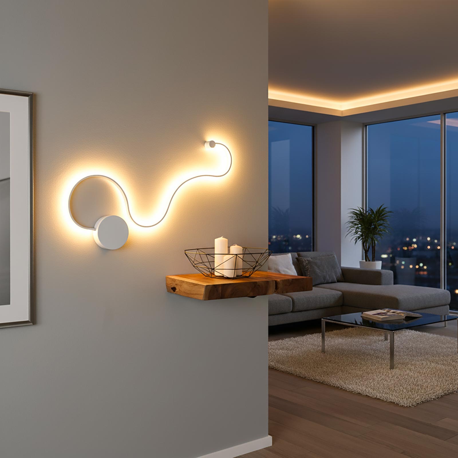 Lampada da parete dal design moderno dotata di LED da 20W con tecnologia CCT a basso consumo energetico, realizzata in alluminio di colore bianco ha la forma curva che richiama quella di un "serpente" ideale per l'illuminazione interna di camere da letto, soggiorno, salotti ma anche all'interno di negozi, attività commerciali, uffici per dare un tocco di eleganza a pareti interne. Il driver integrato consente una facile connessione direttamente alla rete elettrica 230V.