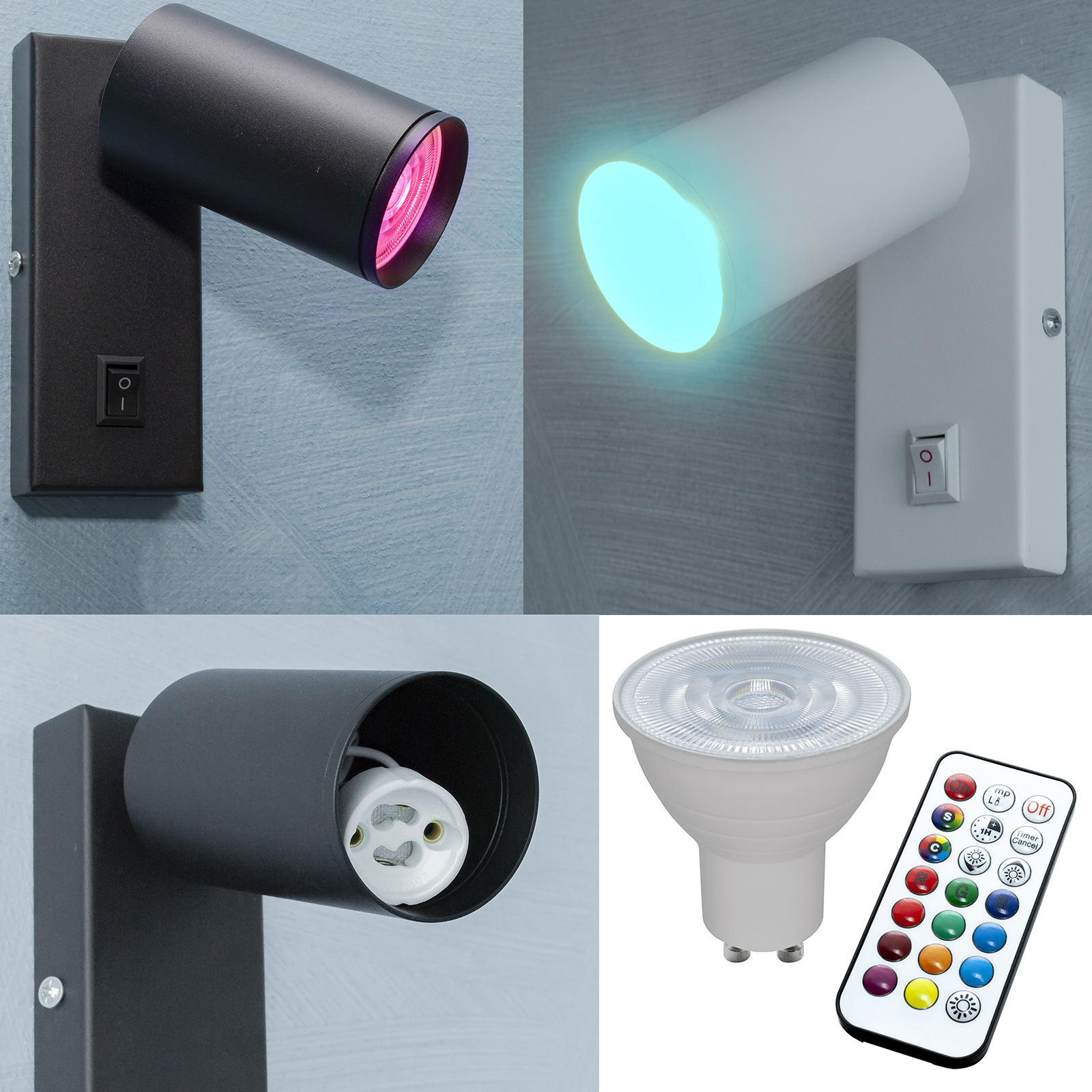 Alimentazione a 230V – attacco lampada GU10 con la capacità di produrre fino a 256 colori selezionabili tramite il telecomando incluso.