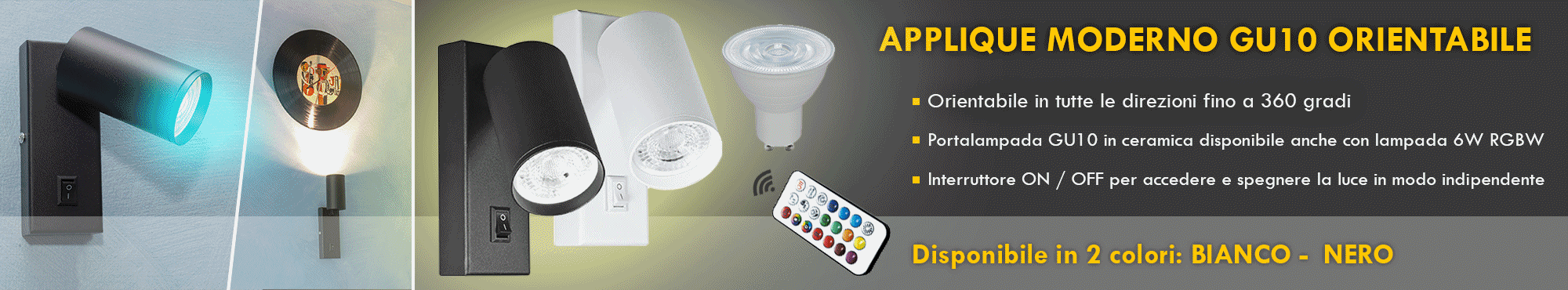 Alimentazione a 230V – attacco lampada GU10 con la capacità di produrre fino a 256 colori selezionabili tramite il telecomando incluso.