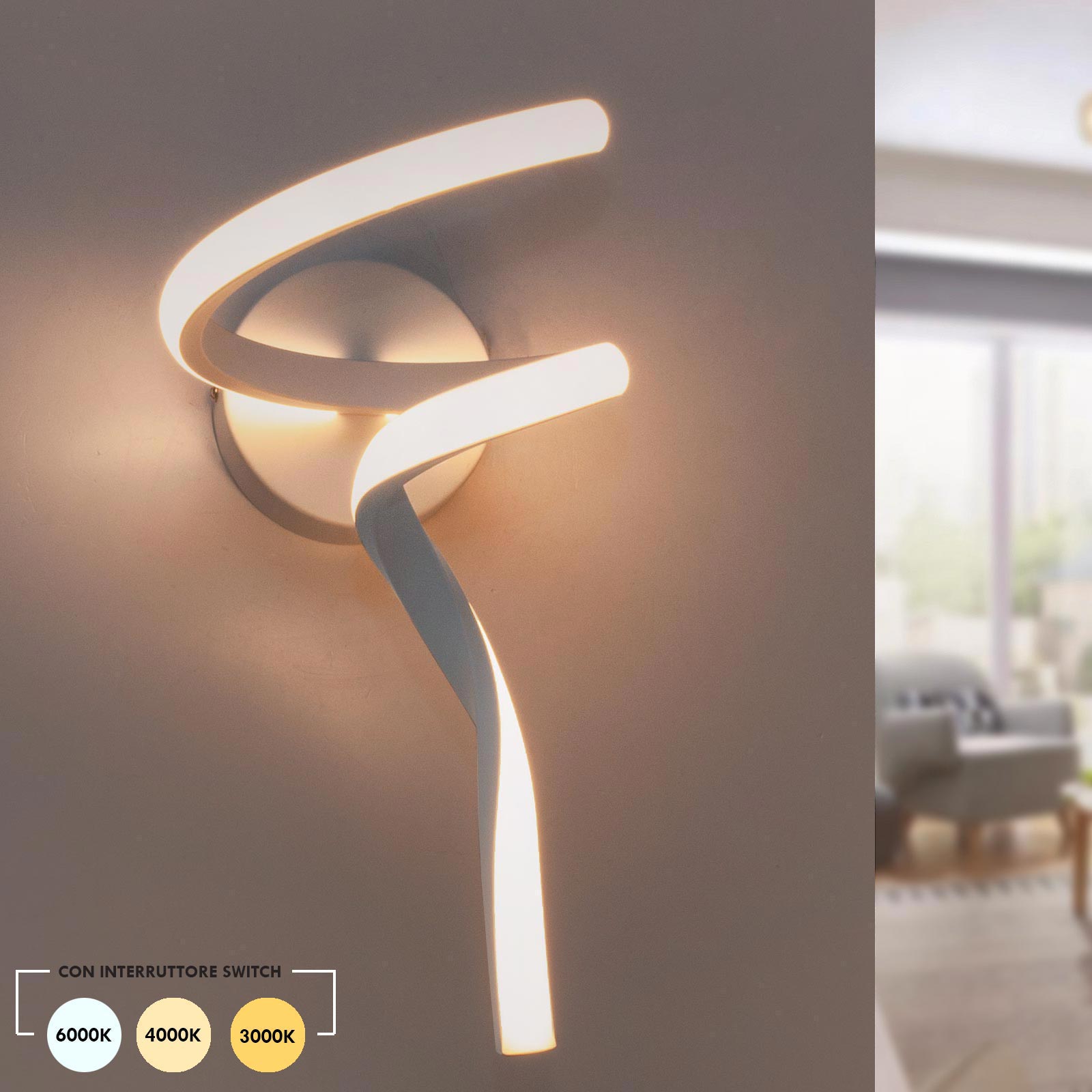 Questa lampada ha la particolarità di emettere 3 temperature di luce: 3000K luce calda, 4000K, luce naturale, 6500K, luce fredda, tutto è possibile grazie all'interurttore switch che consente di selezionare la temperatura di luce desiderata..