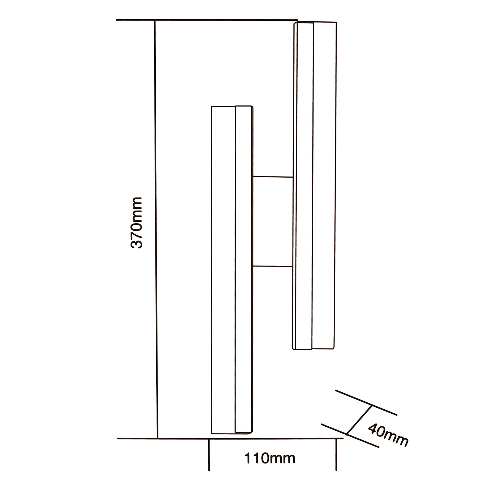 La base di fissaggio misura 85 mm x 100 mm, mentre l'applique ha dimensioni complessive di 370 mm x 110 mm x 40 mm.