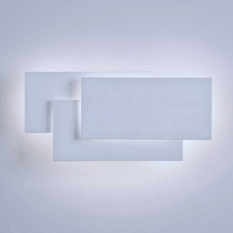 L'applique ha una forma rettangolare composta da tre rettangoli posti uno sull'altro in modo sfalsato, questo genera un effetto luminoso più particolare, è realizzato con struttura in alluminio e vetro acrilico satinato. Viene fornito completo di LED driver per il collegamento diretto alla rete elettrica 230V. L'applique emette un fascio di luce sulla parete di circa 650 lumen con un angolo di luce diffuso di 180 gradi.