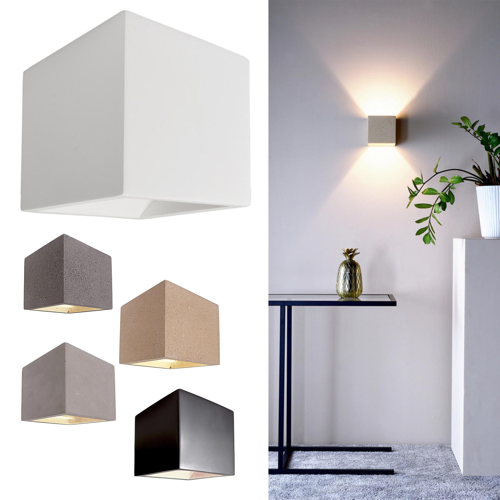 Dai un tocco di stile ai tuoi ambienti interni installando questo applique da parete realizzato in cemento e gesso adatto per ambienti rustici e moderni ideale per illiuminare camere da letto, corridoi, ingressi, studi, saloni, uffici, negozi e in tutti quei posti dove si vuole illuminare con questo piccolo cubo dal grande effetto luminoso.