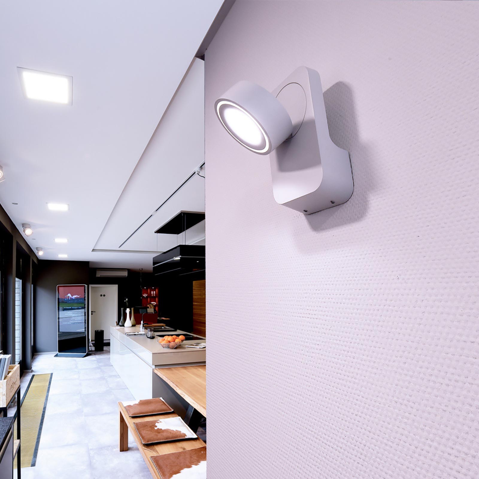 L'applique UNI II è una lampada moderna a LED in alluminio con potenza 12W, progettata per installazione a parete o soffitto, ideale per ambienti commerciali e residenziali. Grazie al design orientabile, il diffusore può essere inclinato fino a 90 gradi, consentendo di dirigere la luce con precisione secondo le esigenze. È inoltre possibile ripiegarlo a filo con il supporto per illuminare verticalmente, trasformandolo in un faretto da soffitto.