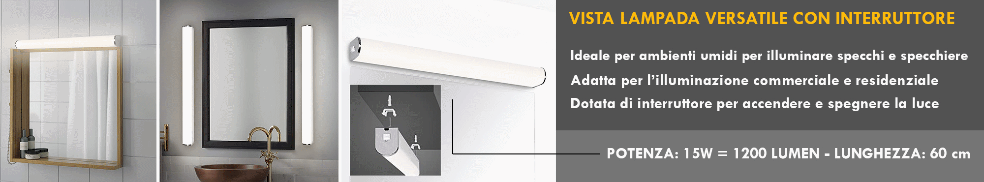 L'applique è molto versatile, può essere installato in diversi modi: a parete in modo orizzontale o verticale, a soffitto, ha una lunghezza di 60cm con un angolo di luce diffusa 120 gradi. Inoltre creando un ponte elettrico è possibile l'installazione di più lampade in serie per specchi molto grandi. Ha una buona luminosità, non abbaglia la vista ed un basso consumo energetico.