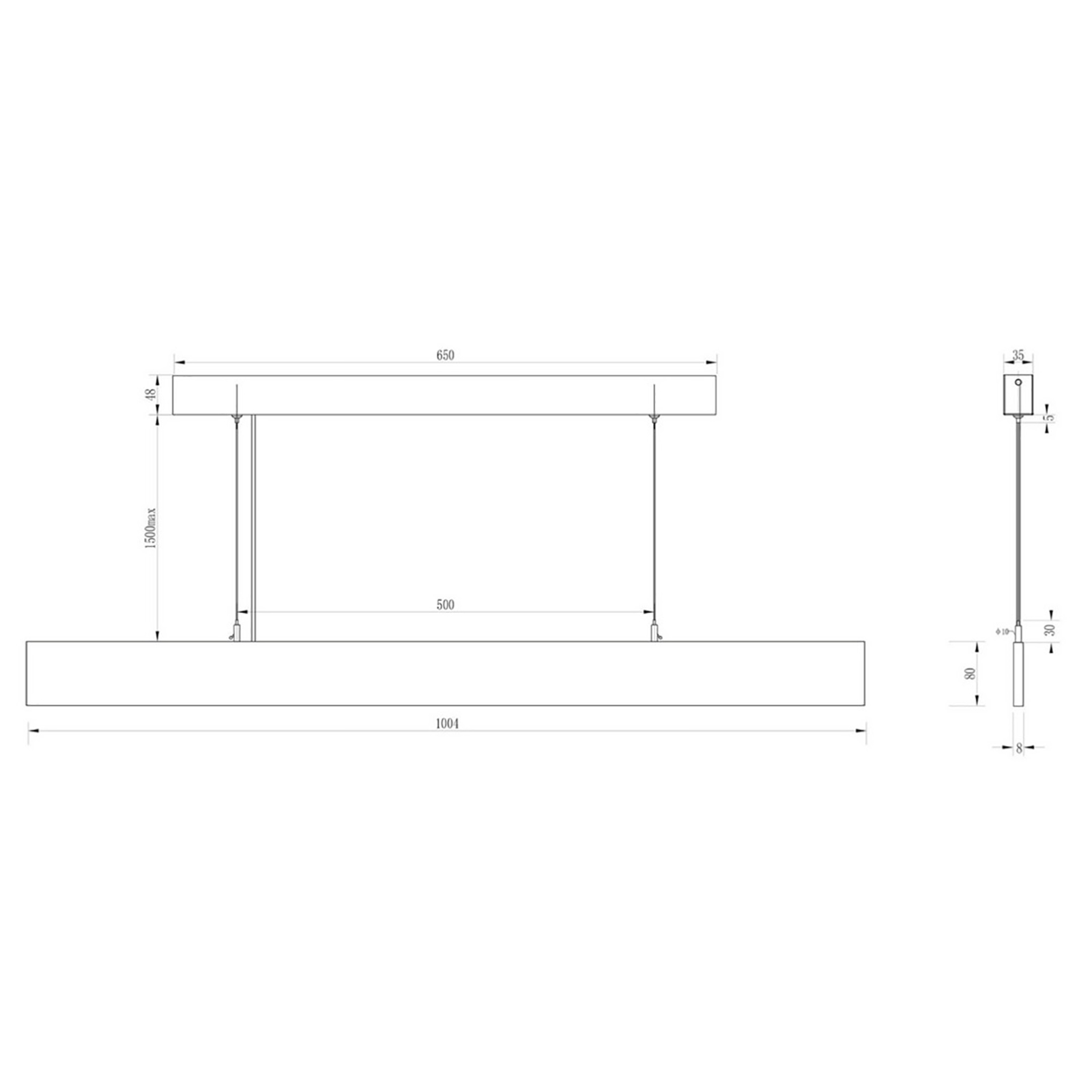 Dimensioni lampada: 1004mm x 80mm x 8mm - Base di fissaggio a soffitto: 650mm x 48mm x 35mm. Lo spessore sottile di questa lampada assicura un design snello e discreto.