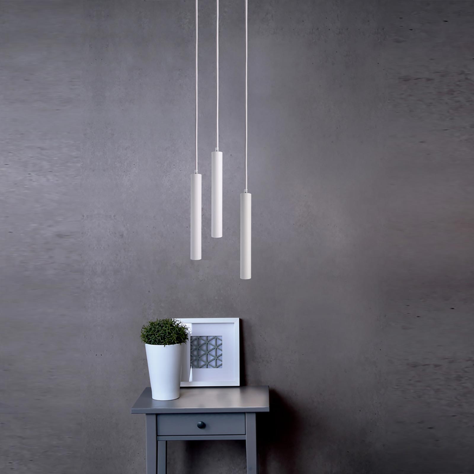 Lampadario a sospensione, moderno ed elegante adatta per installazioni a soffitto composta da 3 pendenti di forma cilindrica dal design slim disponibile in due colori: bianco e nero, realizzata in alluminio di qualità superiore. Dotata di 3 LED COB integrati di ultima generazione a basso consumo energetico, con potenza 15W. Disponibile con temperaura di luce: 2700K luce calda. Perfetta per l'illuminazione di snack bar, cucine, soggiorni, camere da letto, ideale anche per bar, caffè e ristoranti, pizzerie ed in tutti quei posti dove si vuole dare un tocco di eleganza all'ambiente.