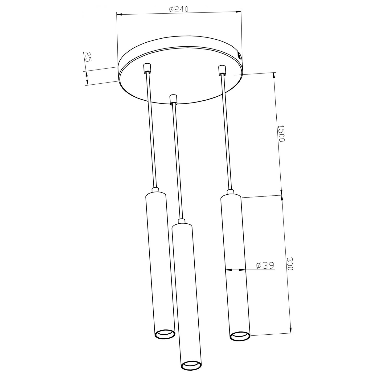 Dimensioni del pendente: 300mm x Ø 39mm - Dimensioni della base di fissaggio: Ø 240mm x 25mm
