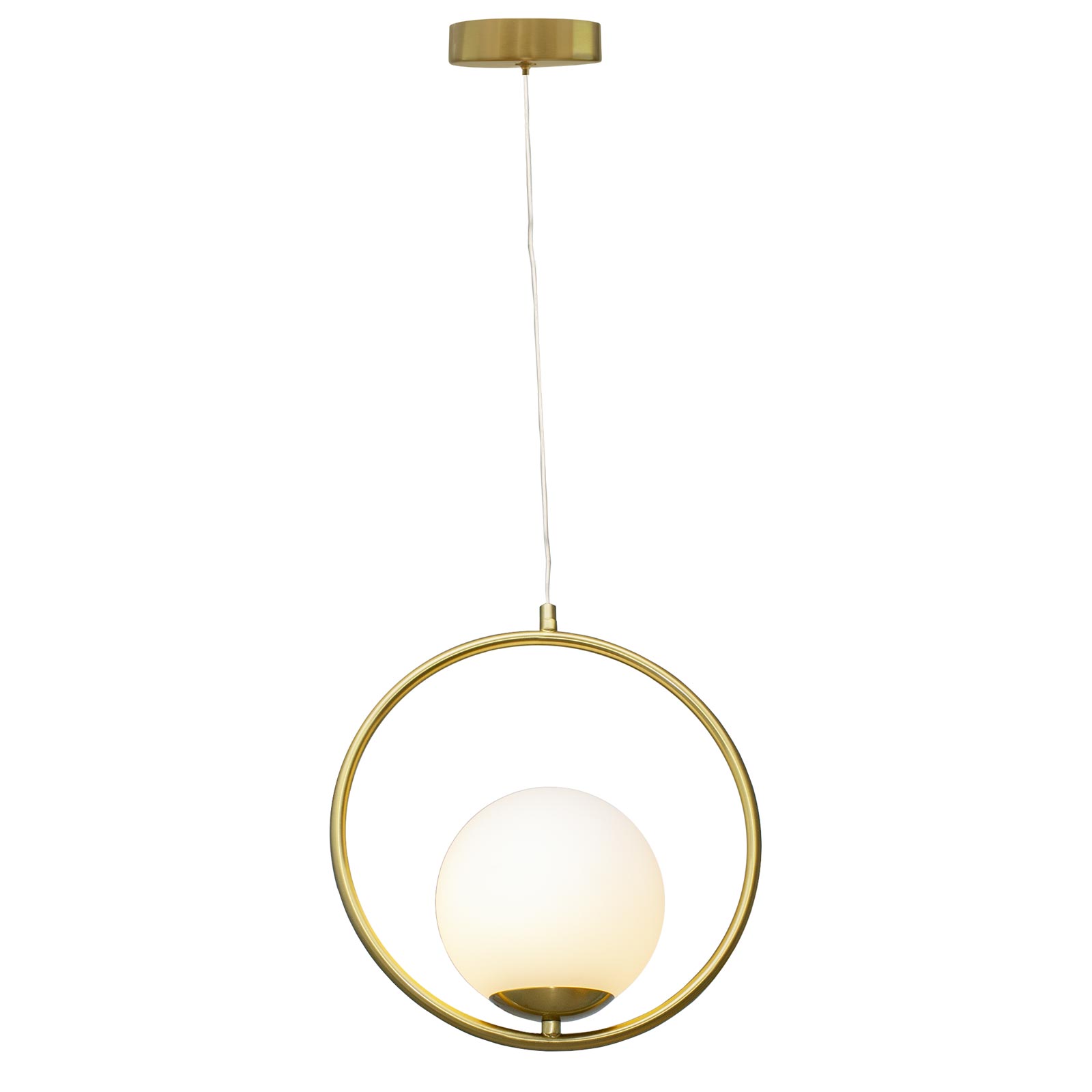 Elegante lampadario dal design moderno con attacco G9 in alluminio di colore bronzo dorato adatto per illuminazione e l'arredamento di soggiorni, cucine moderne, all'interno di ristoranti, sale ricevimento, uffici, negozi per illuminare ed abbellire allo stesso tempo. La struttura in allumino ha la forma di un cerchio con paralume a sfera in vetro bianco opaco che nasconde la lampadina producendo un effetto luminoso più omogeneo che non abbaglia la vista.
