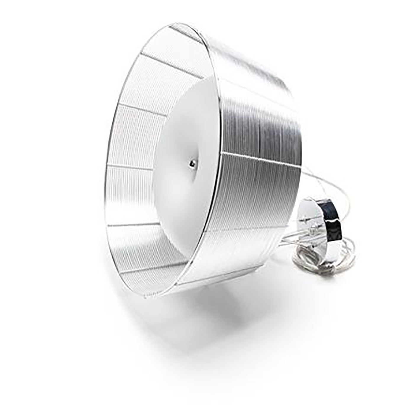 Si alimenta a 230V ed ha una dimensione di 180mm x Ø 390mm, per una sospensione massima di 1.2mt. Dimensioni base di fissaggio: 25mm x Ø 100mm