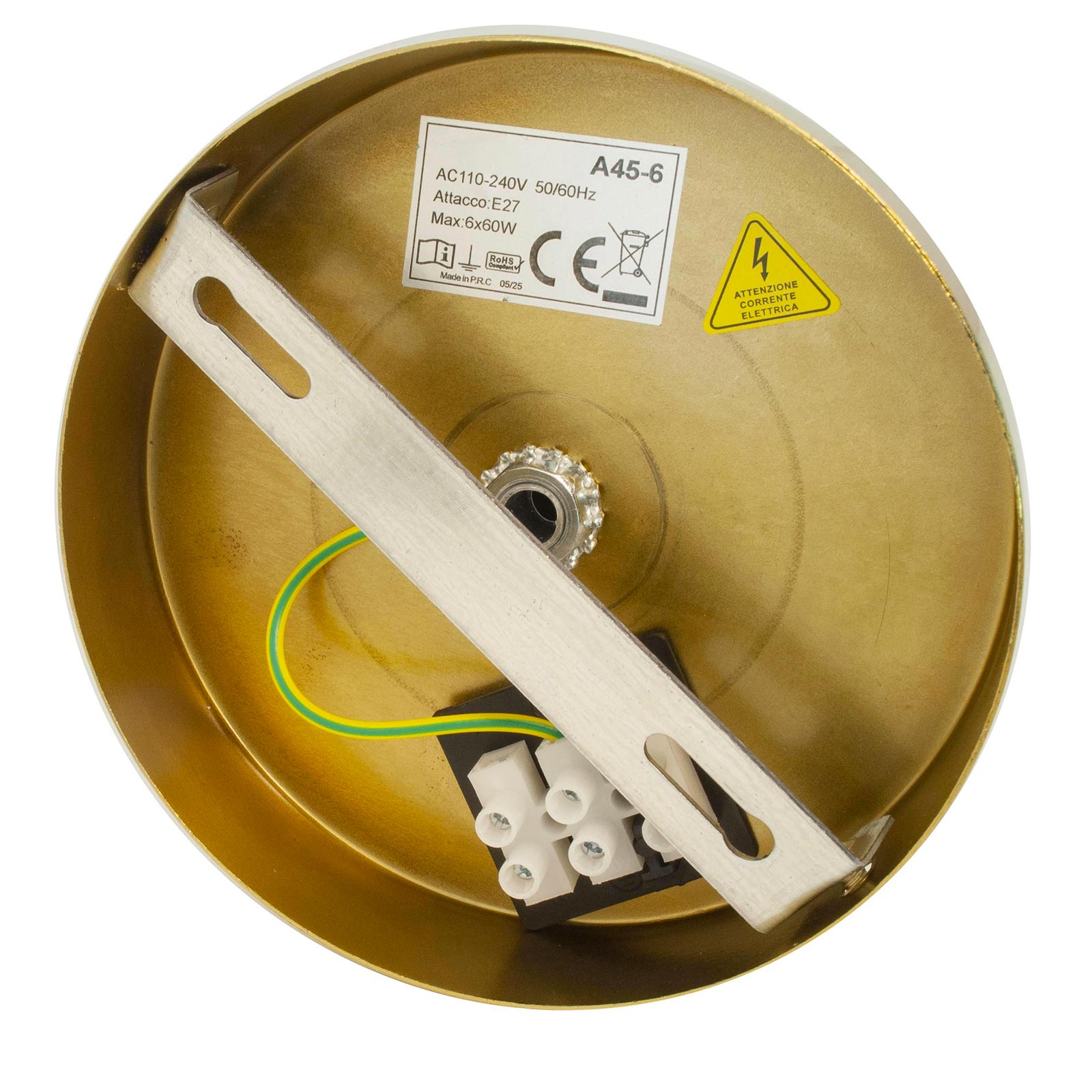 Il corpo del lampadario è dotato di sei braccia con portalampada E27 compatibili con lampadine standard fino a 60W, che consentono di scegliere la temperatura di colore e l’intensità luminosa più adatta all’ambiente. Grazie alle lampade intercambiabili questo lampadario ha una durata maggiore rispetto a prodotti con LED integrato, inoltre la sostituzione delle lampade è molto semplice, questo consente a chiunque di poterle cambiare in caso di rottura. (NB. IL LAMPADARIO VIENE FORNITO SENZA LAMPADE).