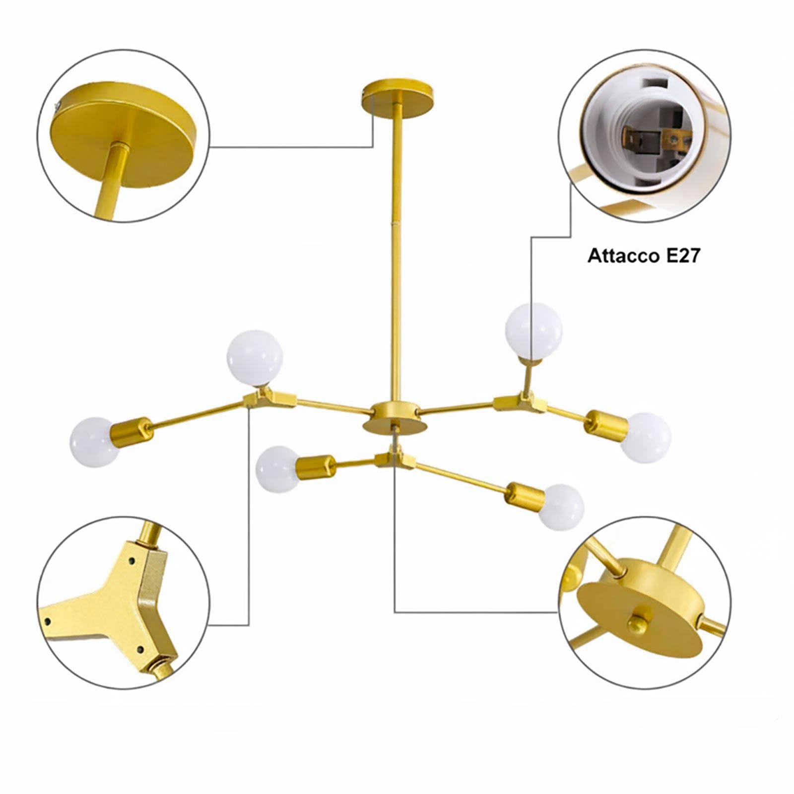 Il corpo del lampadario è dotato di sei braccia con portalampada E27 compatibili con lampadine standard fino a 60W, che consentono di scegliere la temperatura di colore e l’intensità luminosa più adatta all’ambiente. Grazie alle lampade intercambiabili questo lampadario ha una durata maggiore rispetto a prodotti con LED integrato, inoltre la sostituzione delle lampade è molto semplice, questo consente a chiunque di poterle cambiare in caso di rottura. (NB. IL LAMPADARIO VIENE FORNITO SENZA LAMPADE).