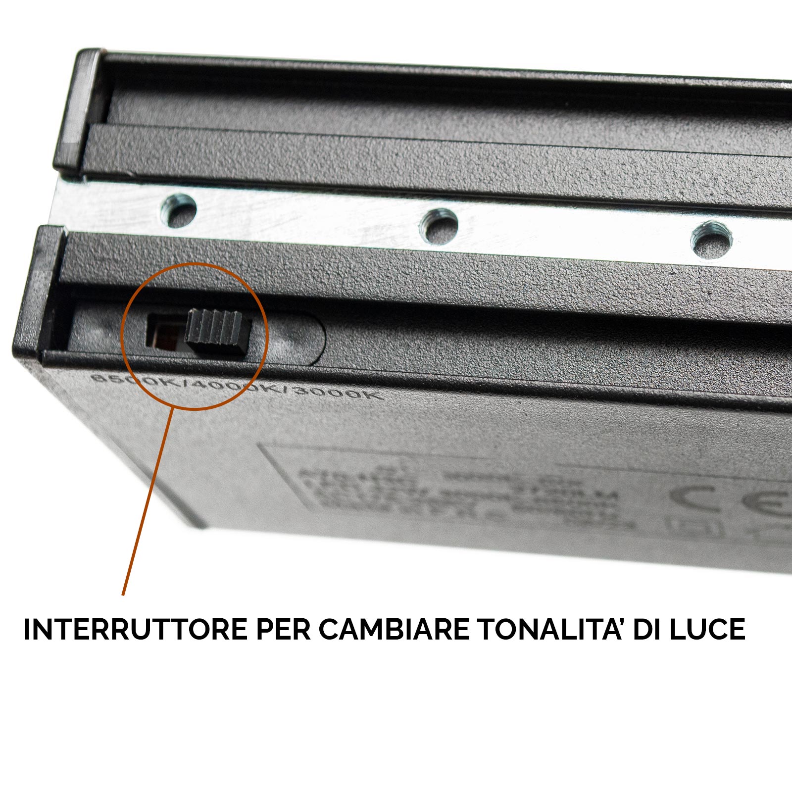 Ed ancora questa barra è dotata di pratico interruttore che consente di scegliere la temperatura di luce desiderata secondo le proprie esigenze: possiamo scegliere tra 3000K luce calda, 4000k luce naturale o 6500K luce fredda. non necessita di alimentatore in quanto si alimenta direttamente alla rete elettrica a 230V.