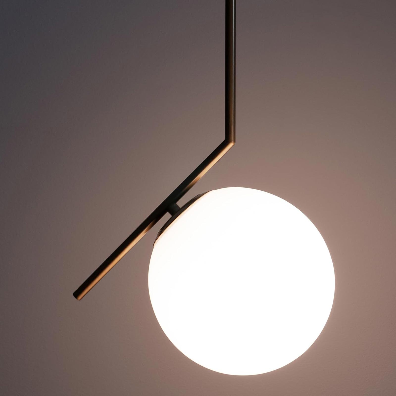 Lampadario pendente G9 con finitura in bronzo, progettato per arredare e illuminare ambienti interni come cucina, soggiorno, camera da letto, ristoranti o aree studio. La lampada a sospensione presenta un design moderno e minimale con struttura in alluminio verniciato bronzo dorato e paralume sferico in vetro bianco opaco, che diffonde una luce morbida e uniforme senza abbagliare.
