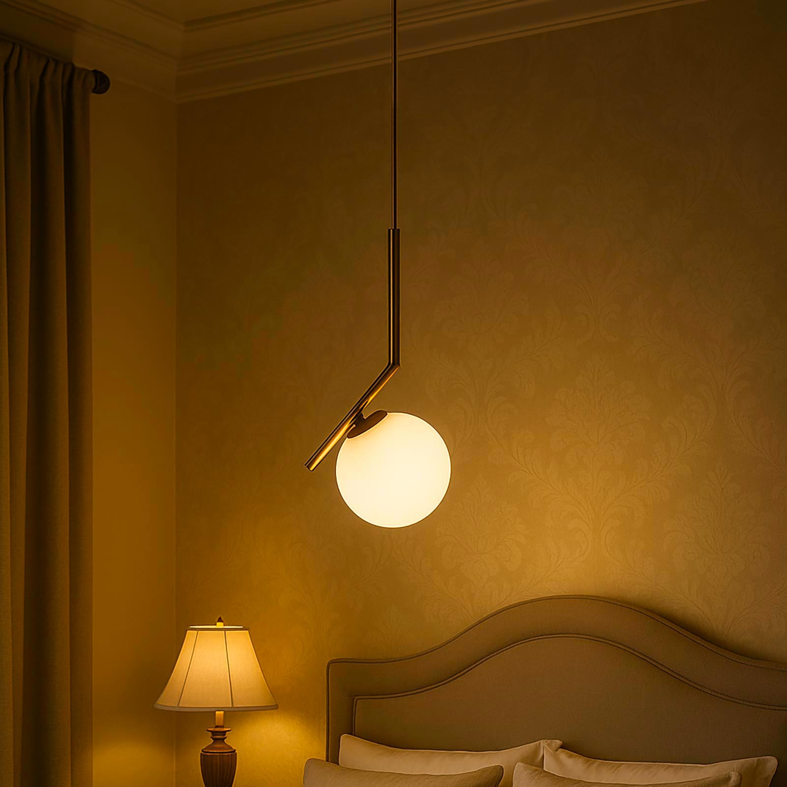 Lampadario pendente G9 con finitura in bronzo, progettato per arredare e illuminare ambienti interni come cucina, soggiorno, camera da letto, ristoranti o aree studio. La lampada a sospensione presenta un design moderno e minimale con struttura in alluminio verniciato bronzo dorato e paralume sferico in vetro bianco opaco, che diffonde una luce morbida e uniforme senza abbagliare.