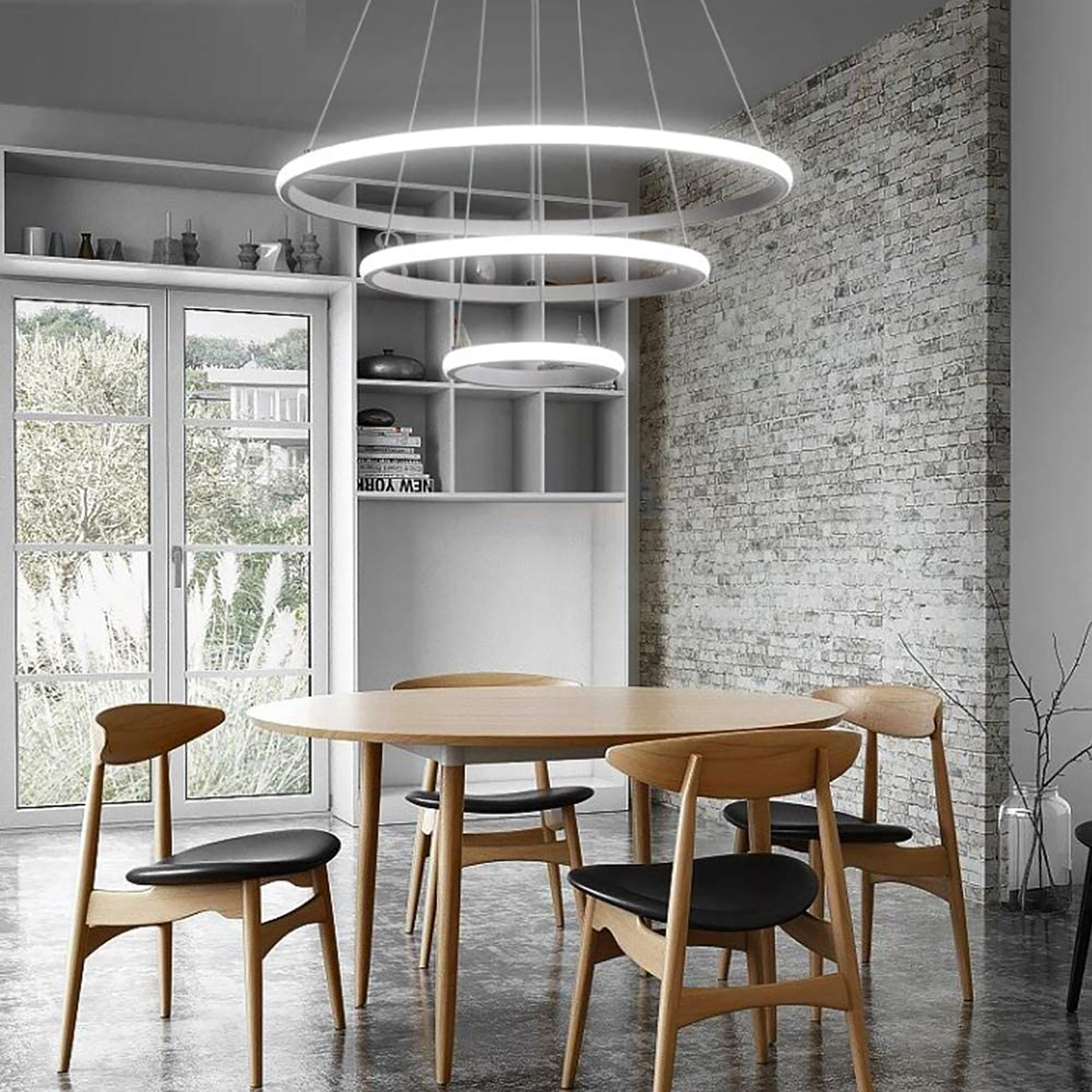 I 3 cerchi sono dotati di LED integrati ad alta efficienza energetica con una potenza di 51W ed un'intensità luminosa di 4080 lumen, inoltre grazie alla possibilità di regolare l'altezza di ogni singolo cerchio, possiamo disporli in modo diverso secondo il proprio gusto, creando degli effetti luminosi particolari, per arredare ed illuminare allo stesso tempo.