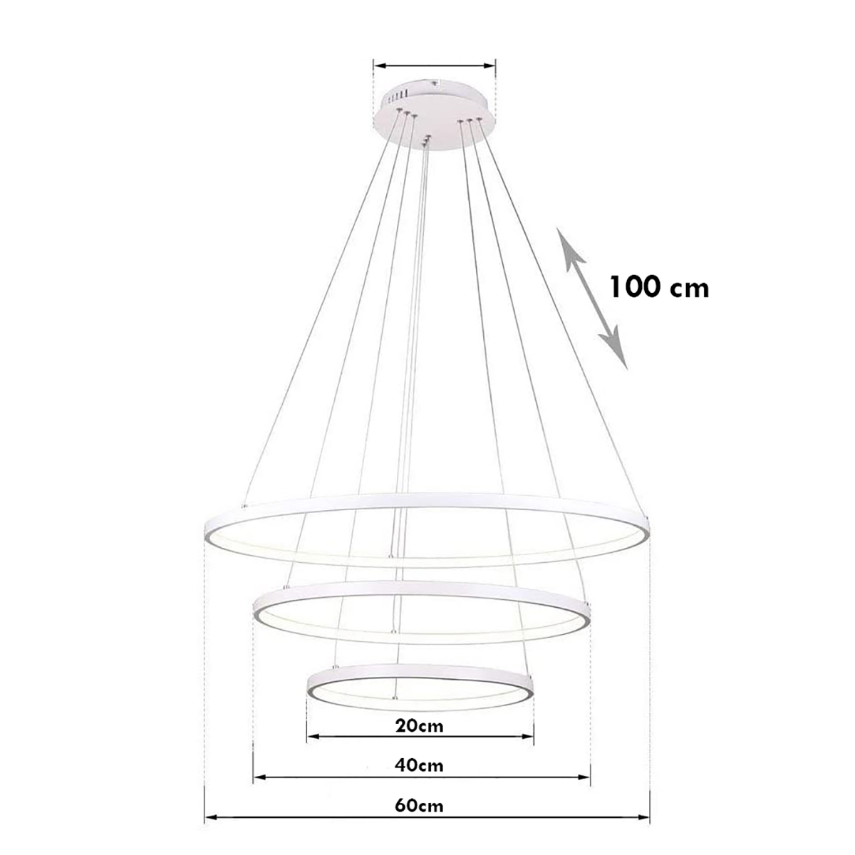 Realizzato in alluminio di colore bianco è ideale per ambienti interni come soggiorni moderni, cucine, uffici, negozi, saloni, salotti, studi ed in tutti quei posti dove si vuole installare una fonte di luce che illumina e decora l'ambiente allo stesso tempo. Inoltre ha una sospensione regolabile con altezza massima di massima di 100 cm. (Ogni cerchio è regolabile in maniera indipendente).