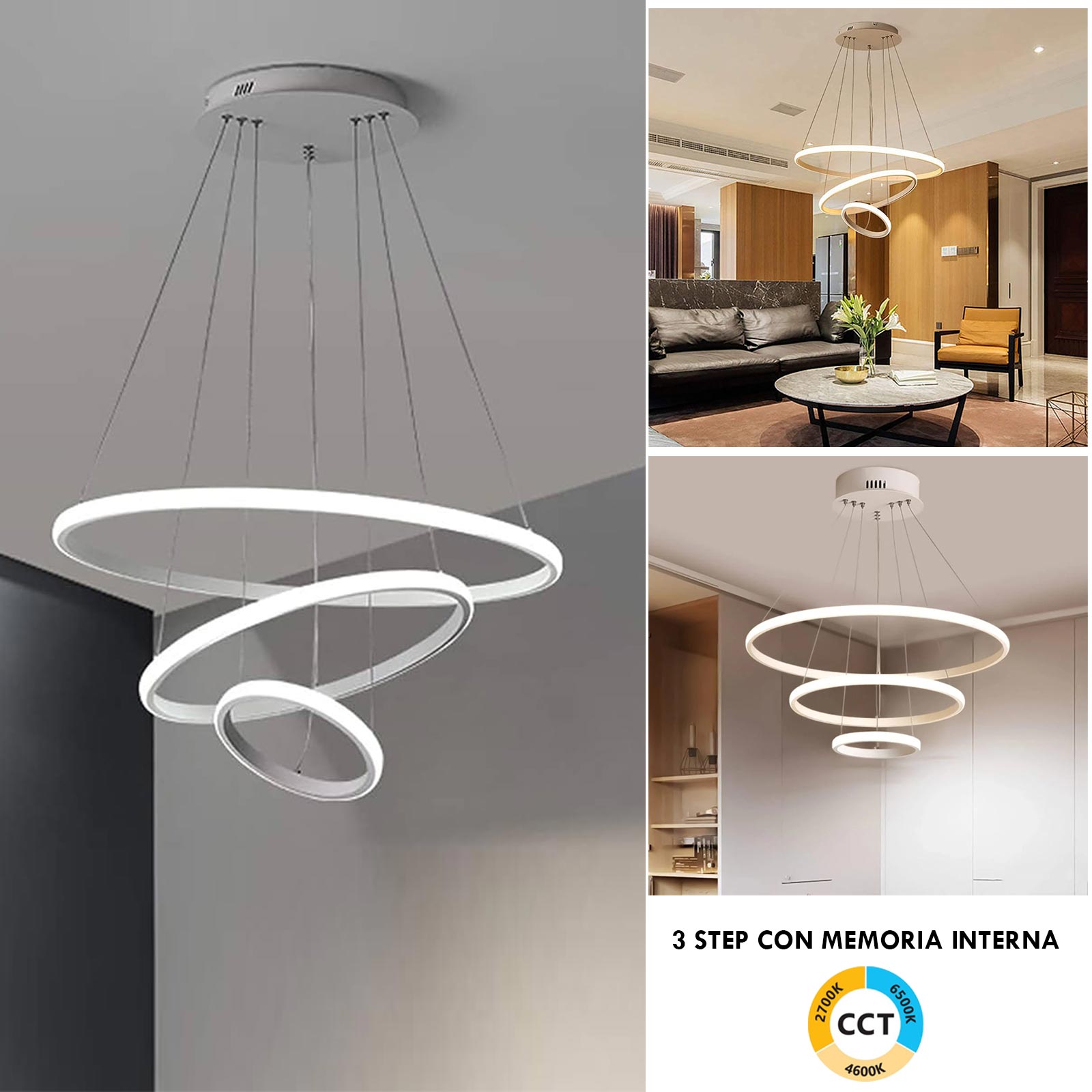Illumina ed arreda i tuoi ambienti interni con questo particolare ed elegante lampadario da soffitto dal design moderno e versatile composto da 3 cerchi di misure diverse per illuminare e decorare ambienti interni creando un effetto ottico particolare. Questo lampadario integra la tecnologia 3 STEP che consente di scegliere la temperatura di luce, adatta per l'ambiente, semplicemente spegnendo ed accendendo l'interruttore della luce.