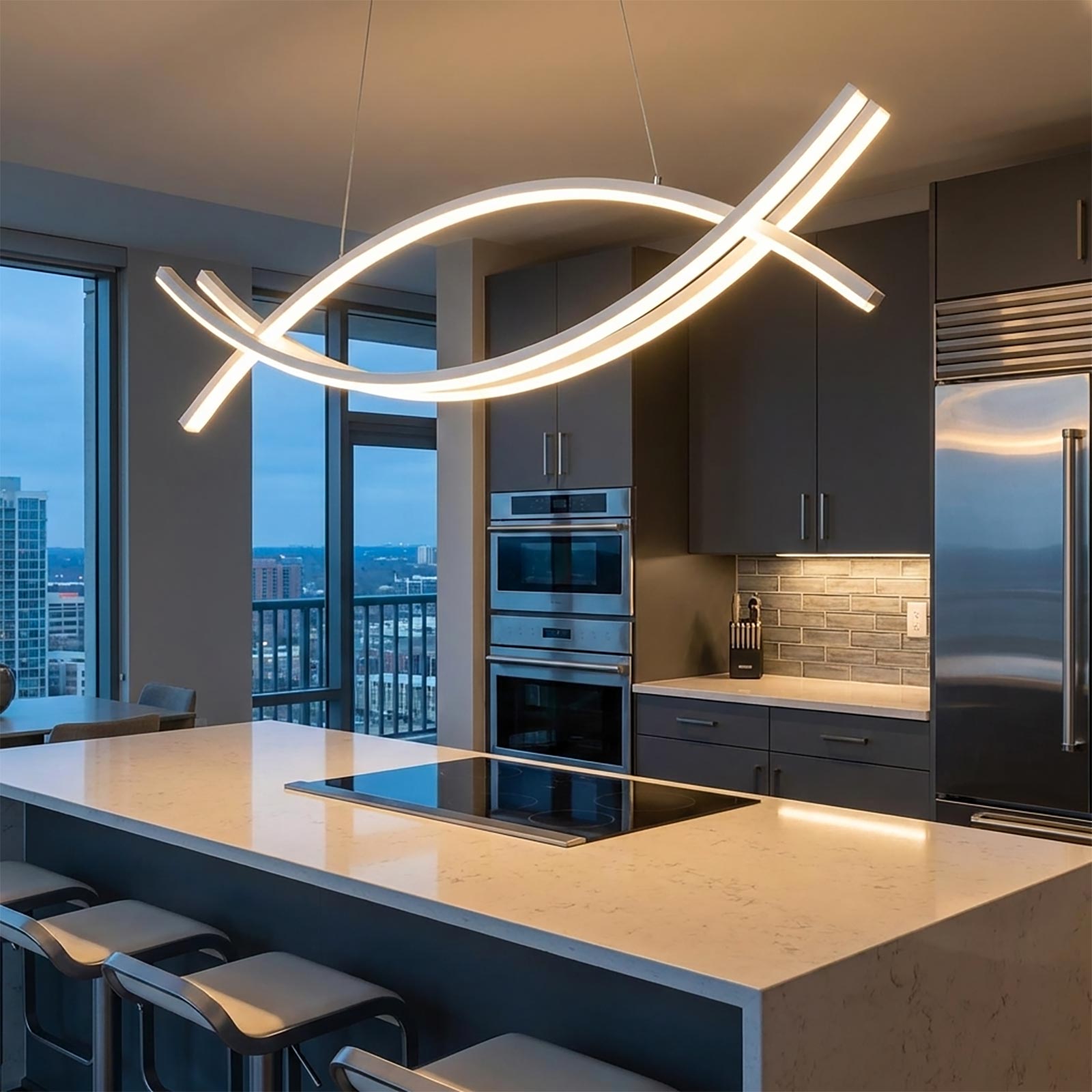 Grazie alla sua estetica contemporanea e alla finitura in alluminio bianco, questo lampadario è la scelta ideale per chi cerca un'illuminazione d'impatto per cucine moderne, soggiorni, uffici, saloni, studi professionali o locali commerciali come bar, pizzerie e ristoranti.