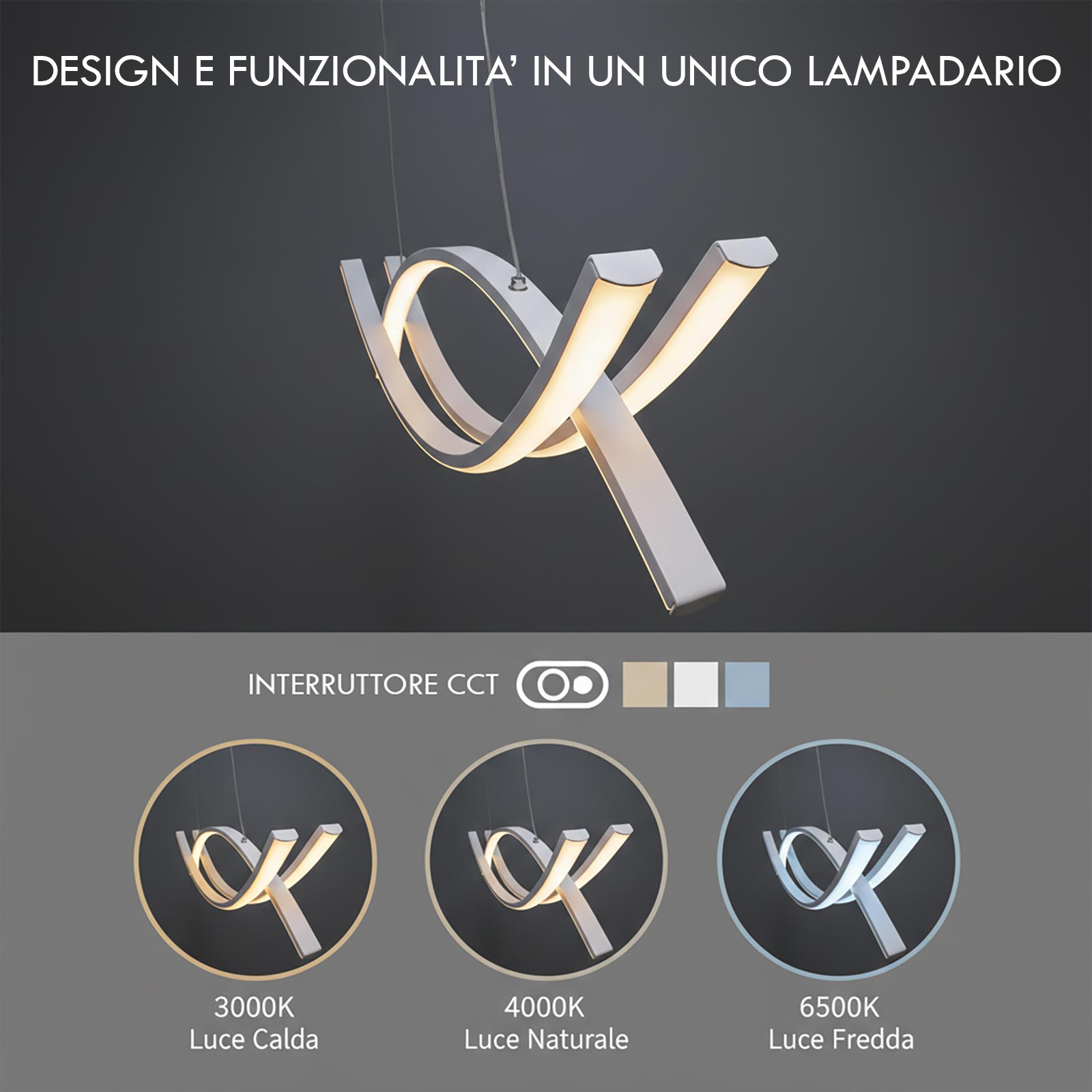Rinnova i tuoi spazi con questo esclusivo lampadario moderno a LED, caratterizzato da un design stilizzato composto da tre barre curve che si intrecciano in un gioco armonioso di luce. Non è solo un corpo illuminante, ma un vero e proprio elemento d'arredo capace di donare dinamismo e originalità a qualsiasi ambiente, anche quando è spento.