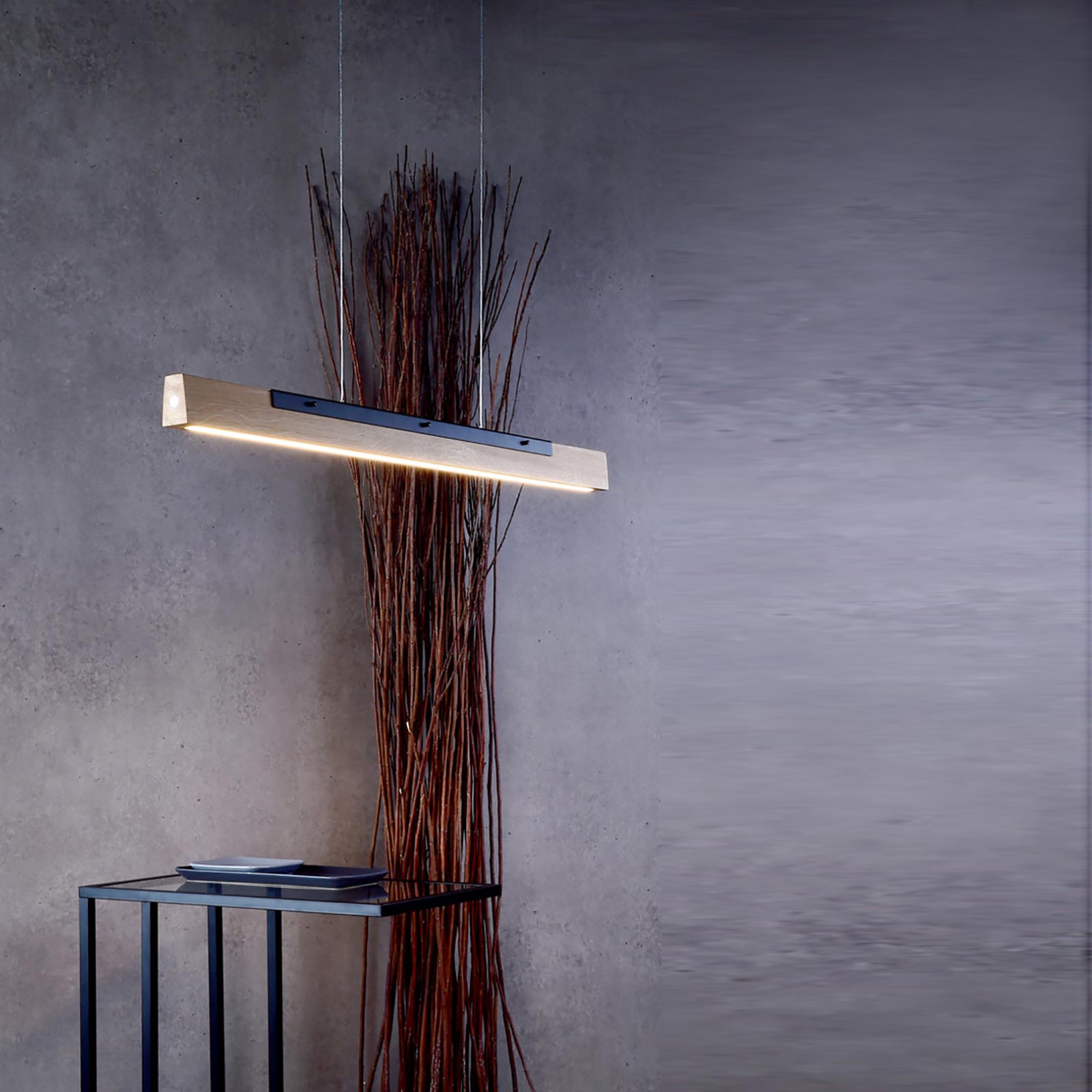 Elegante e funzionale lampada LED a sospensione realizzata in legno di quecrcia di alta qualità con materia prima certificata FSC rovere europeo dal design moderno dotata di led integrati smd ad alta luminosità con un consumo energetico ridotto, ideale per uso commerciale in ambienti interni come negozi, uffici, attività commerciali, studi medici, centri commerciali, ed in tutti quei posti dove si vuole illuminare ed arredare i propri ambienti interni. Dimmerabile tramite un sensore tattile al lato del pendente.