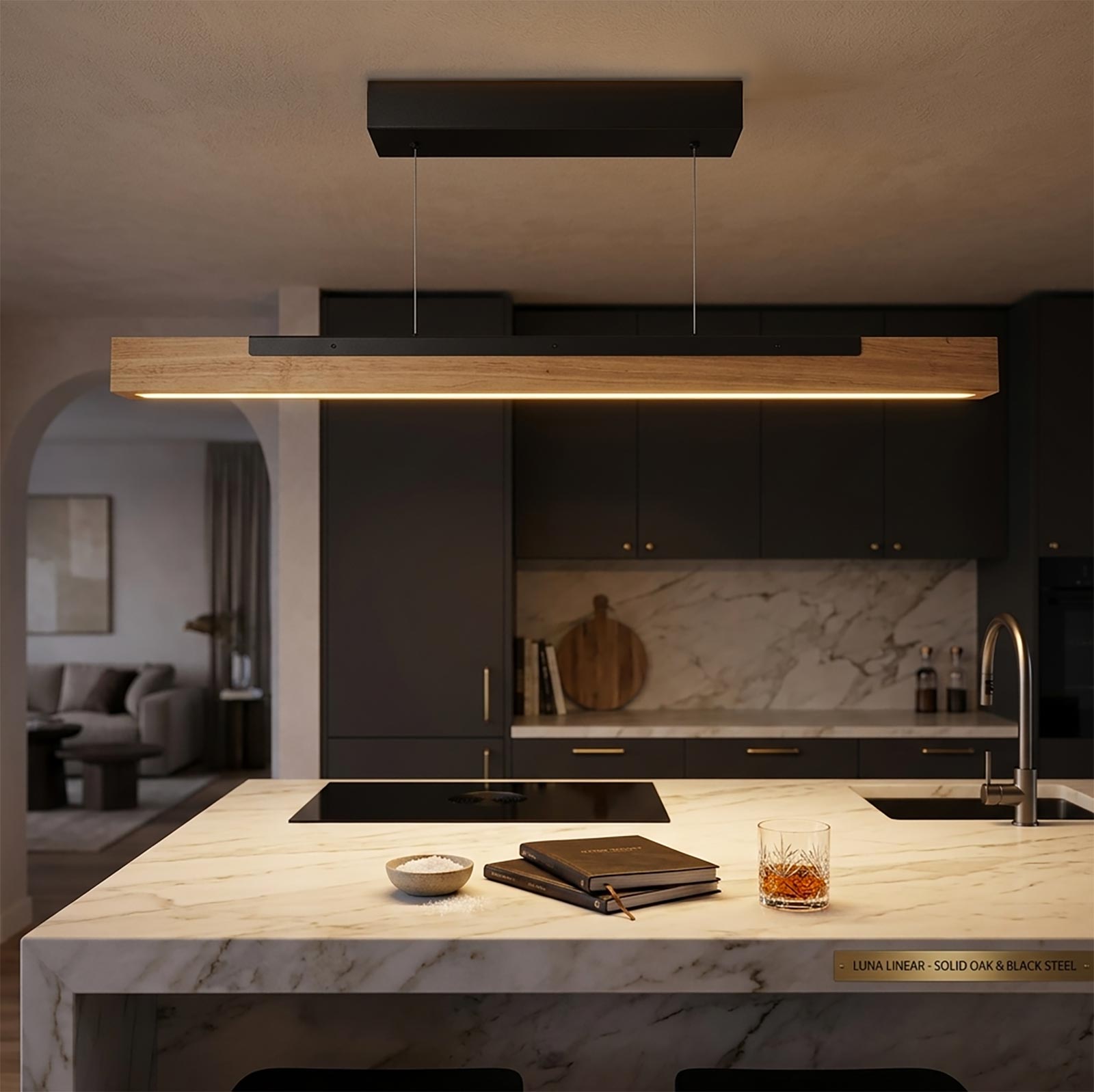Elegante e funzionale lampada LED a sospensione realizzata in legno di quecrcia di alta qualità con materia prima certificata FSC rovere europeo dal design moderno dotata di led integrati smd ad alta luminosità con un consumo energetico ridotto, ideale per uso commerciale in ambienti interni come negozi, uffici, attività commerciali, studi medici, centri commerciali, ed in tutti quei posti dove si vuole illuminare ed arredare i propri ambienti interni. Dimmerabile tramite un sensore tattile al lato del pendente.