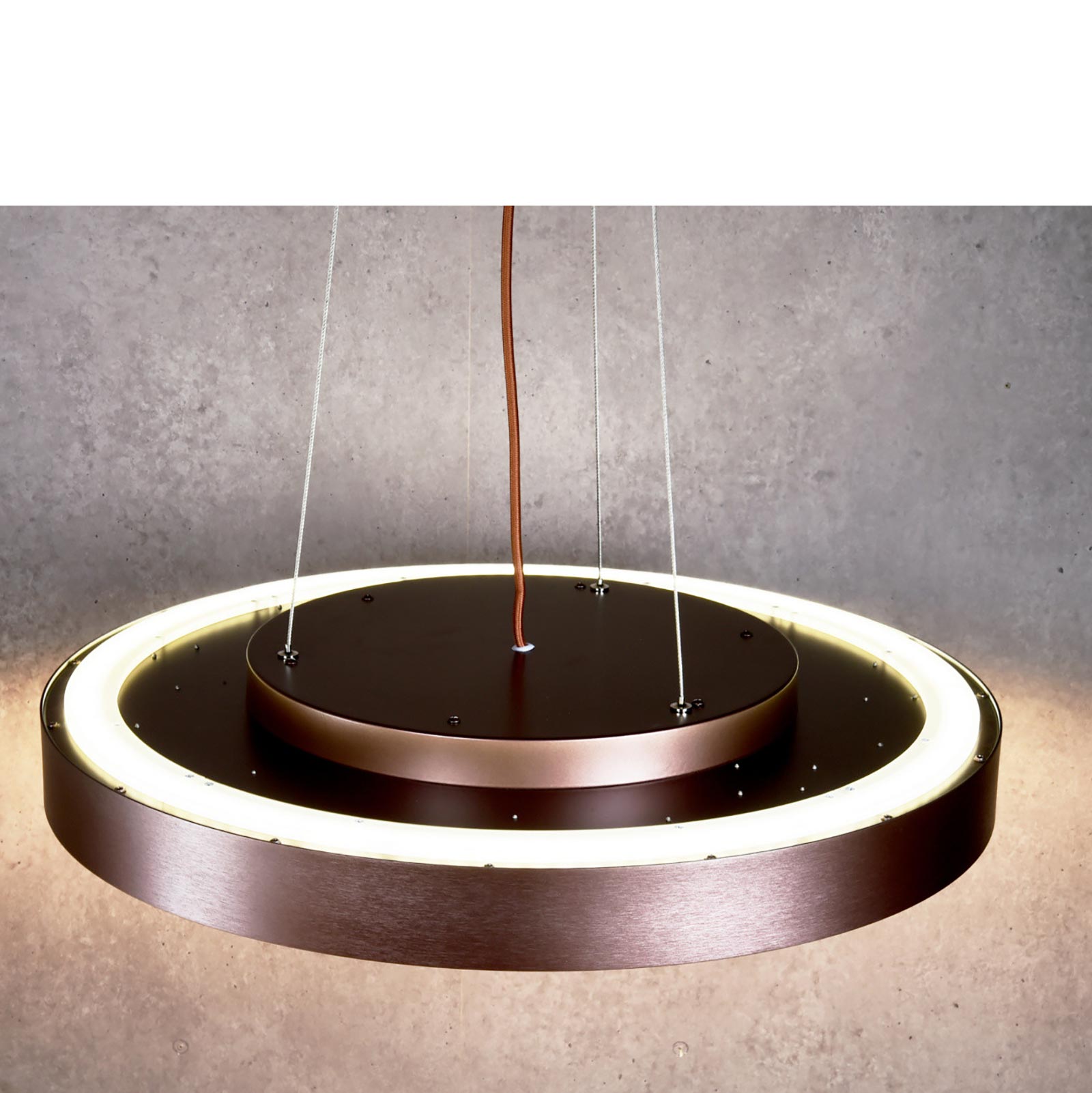 Il lampadario è disponibile in 4 colori: Bianco, Nero, Argento e Marrone questo consente di scegliere il colore adatto all'arredamento. Facile da installare viene fornito completo di rosetta copri fili in metallo da cui partono 3 fili in acciaio che sostengono il cerchio luminoso. La sospensione è regolabile con un altezza massima di 1800mm. Il lampadario ha un'intensità luminosa di 3500 lumen con un angolo di diffusione ampio di 115 gradi.