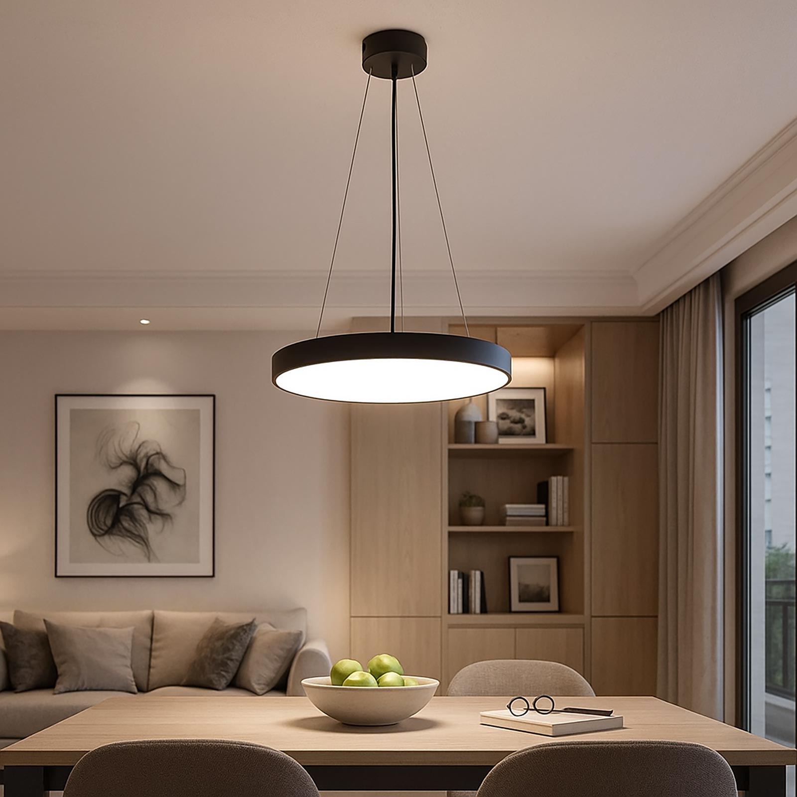 Il lampadario è disponibile in 4 colori: Bianco, Nero, Argento e Marrone questo consente di scegliere il colore adatto all'arredamento. Facile da installare viene fornito completo di rosetta copri fili in metallo da cui partono 3 fili in acciaio che sostengono il cerchio luminoso. La sospensione è regolabile con un altezza massima di 3000mm. Il lampadario ha un'intensità luminosa di 8700 lumen con un angolo di diffusione ampio di 115 gradi.