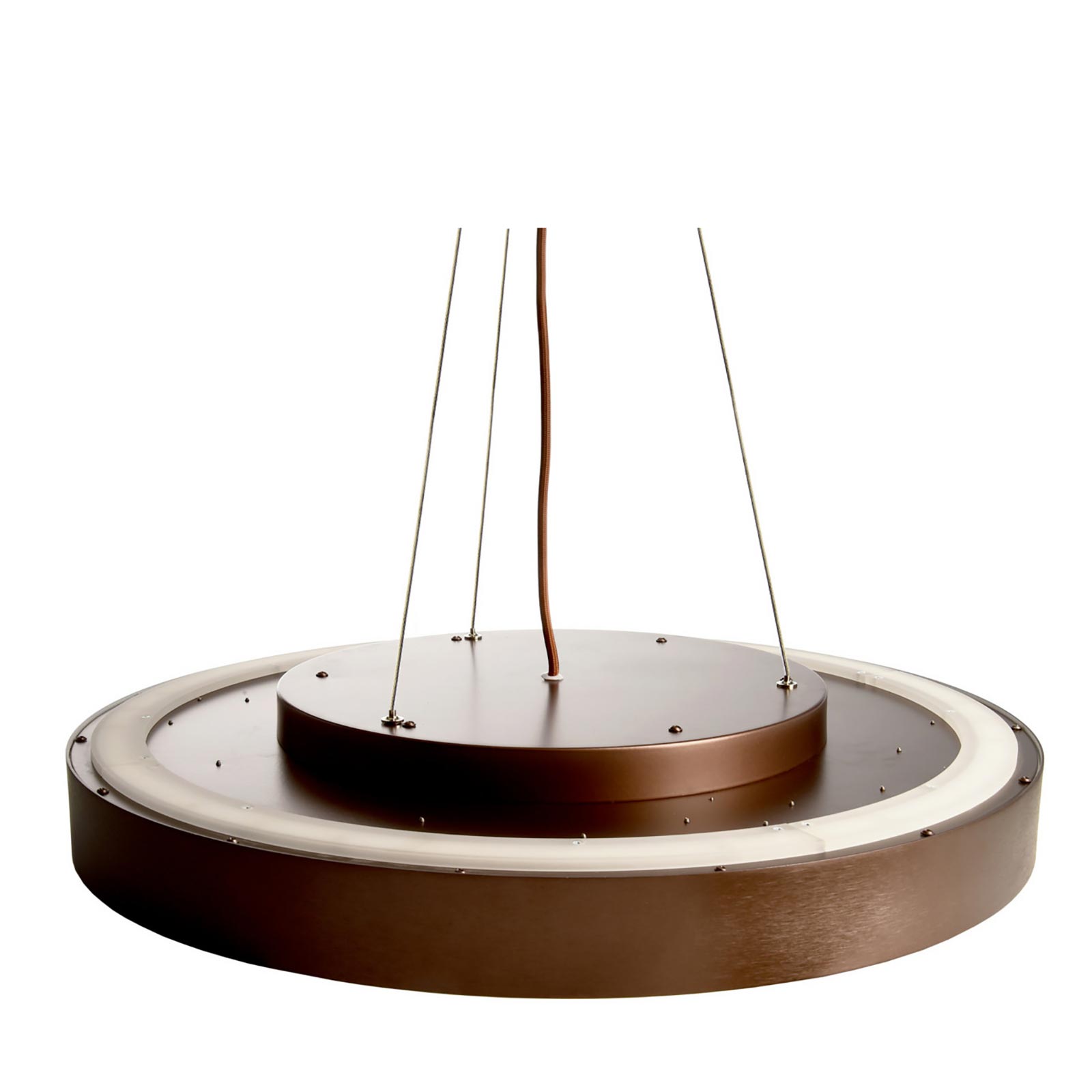 Il lampadario è disponibile in 4 colori: Bianco, Nero, Argento e Marrone questo consente di scegliere il colore adatto all'arredamento. Facile da installare viene fornito completo di rosetta copri fili in metallo da cui partono 3 fili in acciaio che sostengono il cerchio luminoso. La sospensione è regolabile con un altezza massima di 3000mm. Il lampadario ha un'intensità luminosa di 8700 lumen con un angolo di diffusione ampio di 115 gradi.