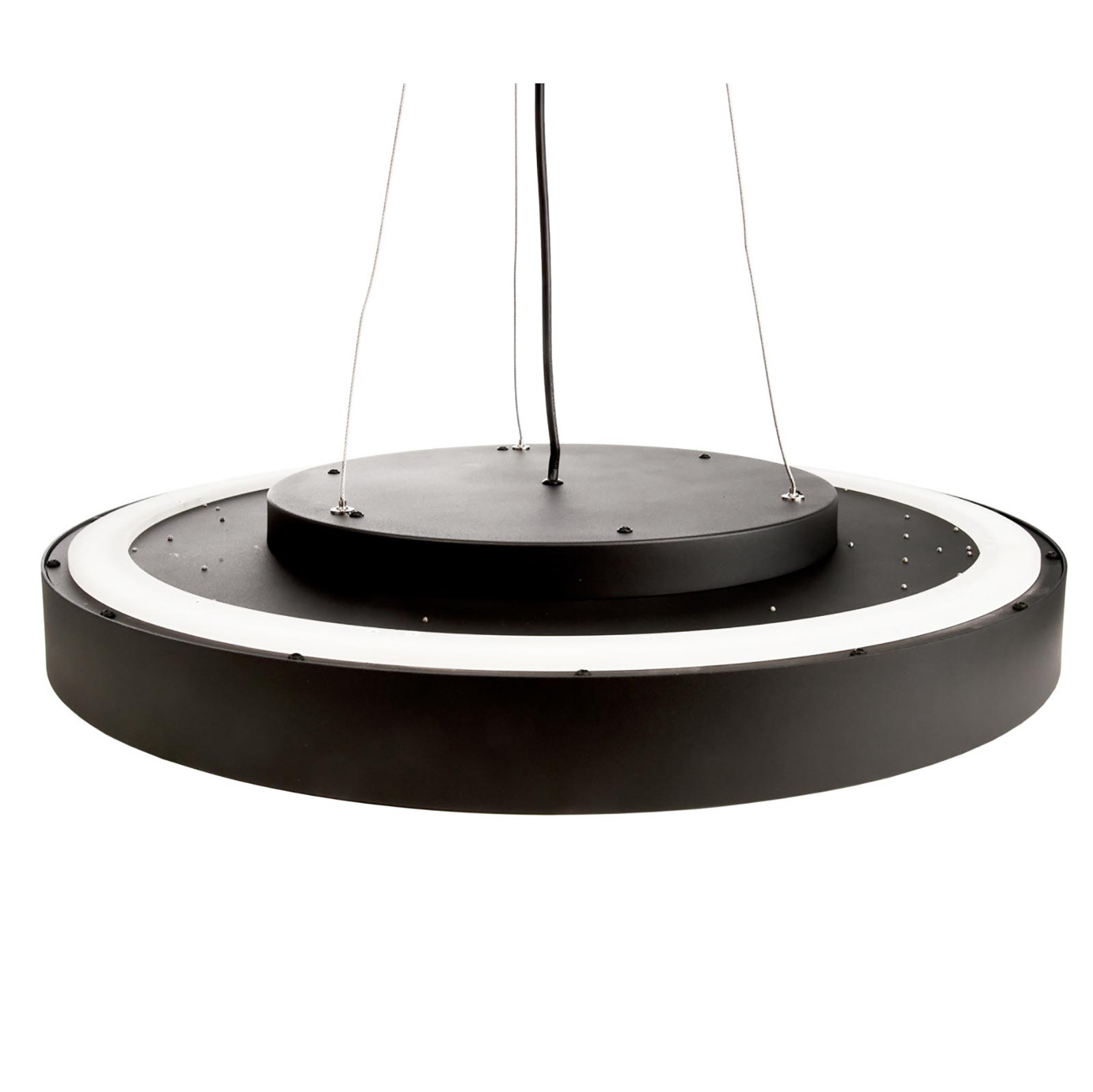 Il lampadario è disponibile in 4 colori: Bianco, Nero, Argento e Marrone questo consente di scegliere il colore adatto all'arredamento. Facile da installare viene fornito completo di rosetta copri fili in metallo da cui partono 3 fili in acciaio che sostengono il cerchio luminoso. La sospensione è regolabile con un altezza massima di 3000mm. Il lampadario ha un'intensità luminosa di 8700 lumen con un angolo di diffusione ampio di 115 gradi.