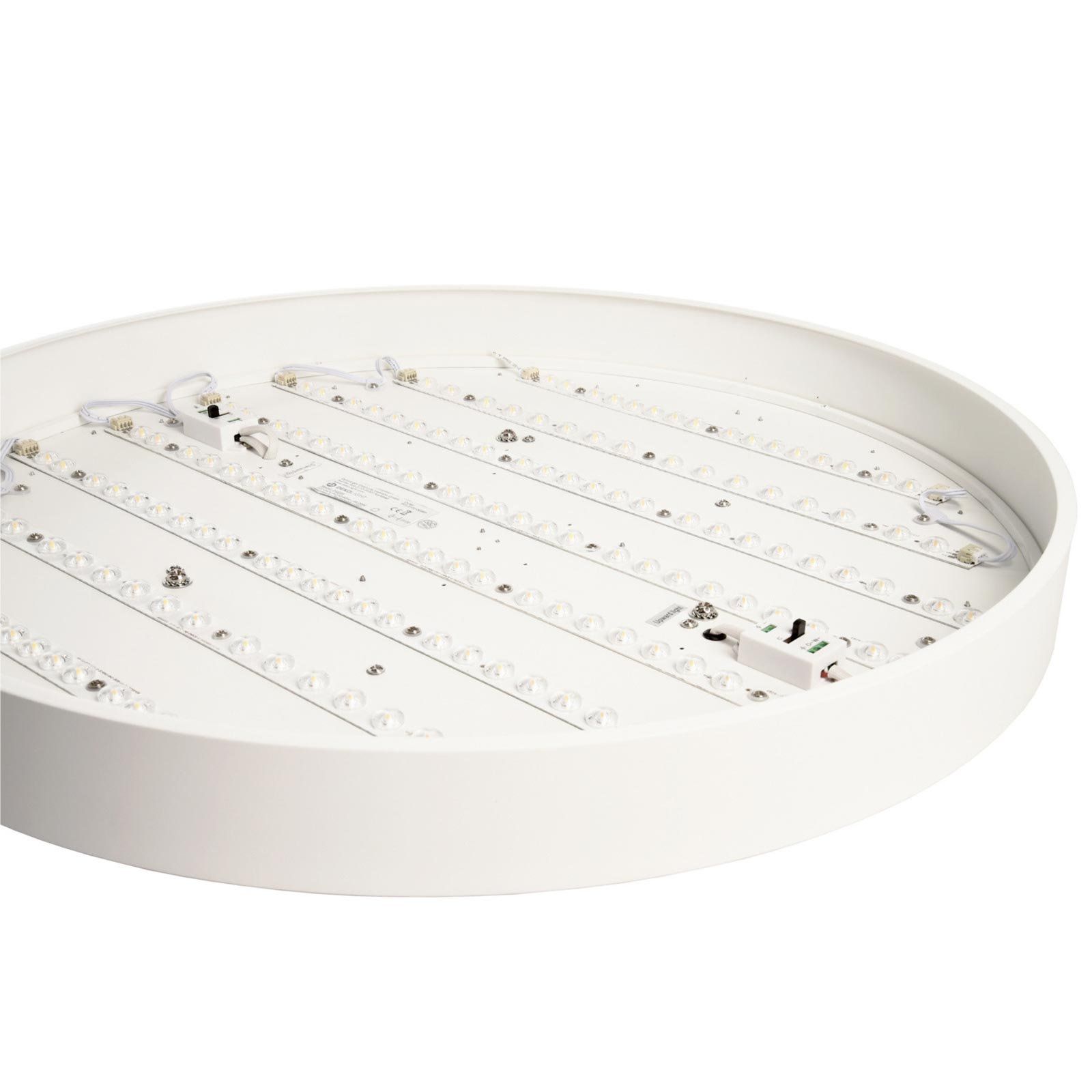 Il lampadario è disponibile in 4 colori: Bianco, Nero, Argento e Marrone questo consente di scegliere il colore adatto all'arredamento. Facile da installare viene fornito completo di rosetta copri fili in metallo da cui partono 3 fili in acciaio che sostengono il cerchio luminoso. La sospensione è regolabile con un altezza massima di 3000mm. Il lampadario ha un'intensità luminosa di 8700 lumen con un angolo di diffusione ampio di 115 gradi.