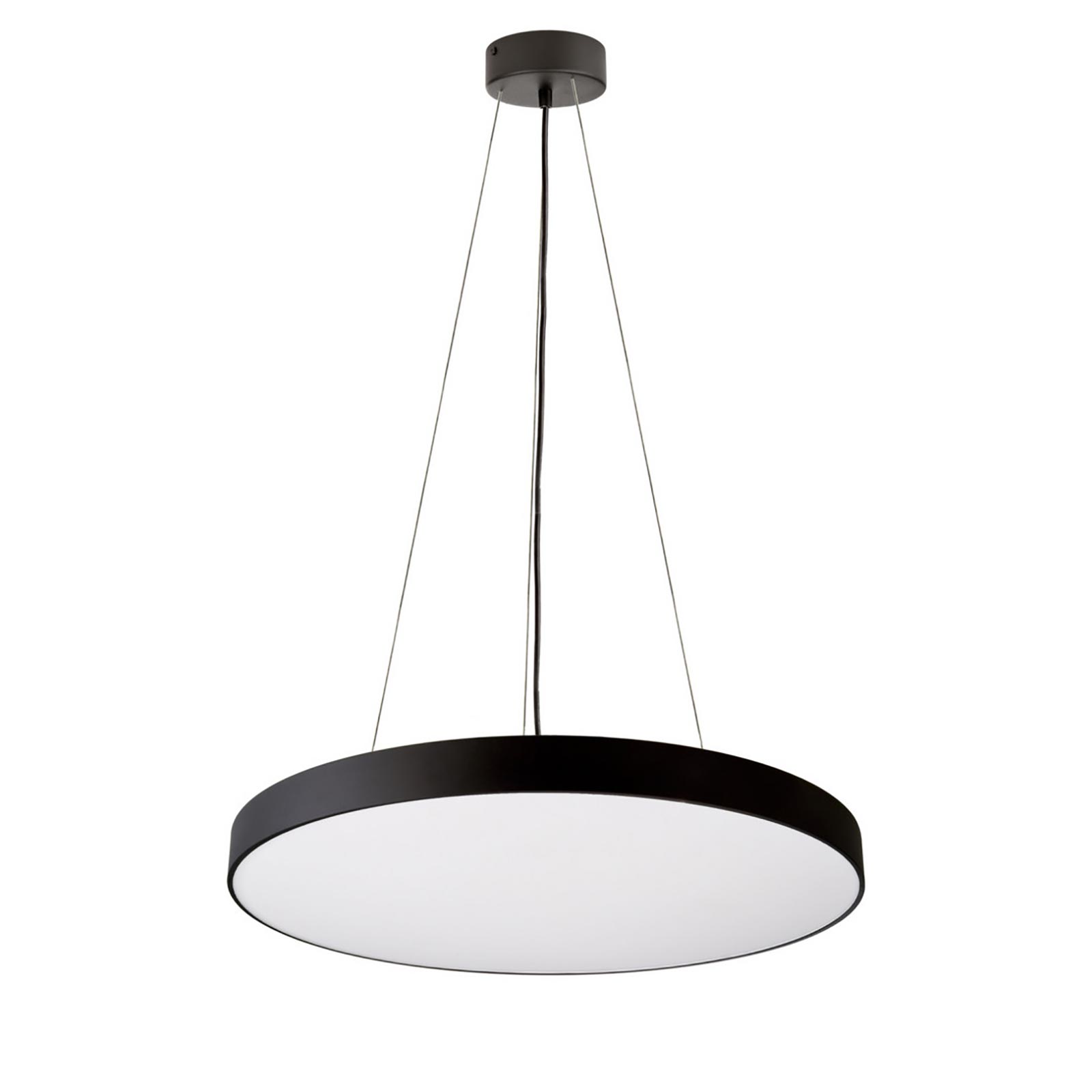 Il lampadario è disponibile in 4 colori: Bianco, Nero, Argento e Marrone questo consente di scegliere il colore adatto all'arredamento. Facile da installare viene fornito completo di rosetta copri fili in metallo da cui partono 3 fili in acciaio che sostengono il cerchio luminoso. La sospensione è regolabile con un altezza massima di 3000mm. Il lampadario ha un'intensità luminosa di 8700 lumen con un angolo di diffusione ampio di 115 gradi.
