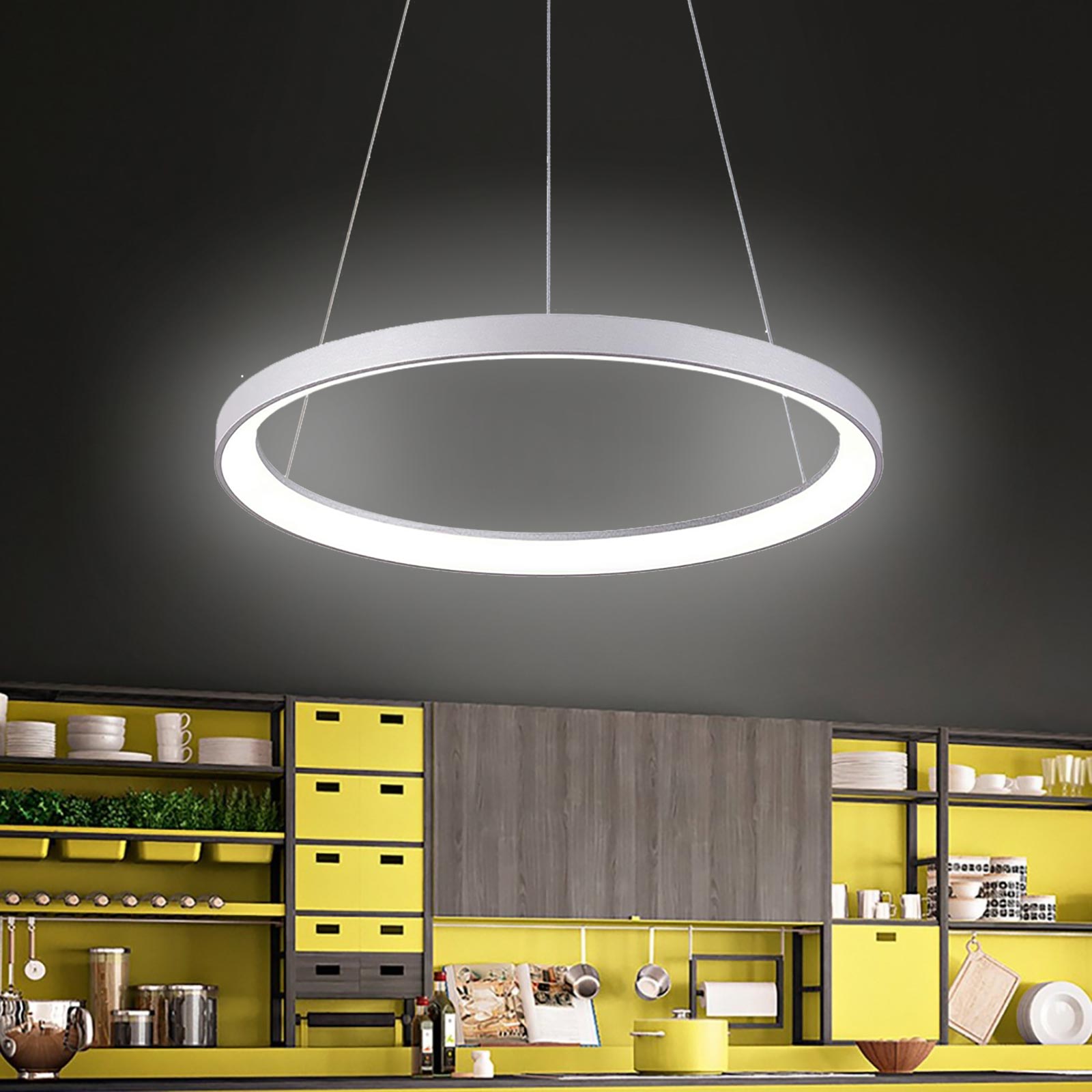 MEROPE 400 Lampadario dimmerabile moderno con 144 LED CCT integrati ad alta efficienza energetica con potenza 30W ideale per l'illuminazione e l'arredamento interno di cucine moderne, soggiorni, salotti, saloni, uffici, negozi per dare un tocco di originalità ad ambienti come pizzerie, ristoranti, sale da the, bar. La lampada ha una forma circolare ed è realizzata in alluminio di ottima qualità con rosetta coprifili sempre in alluminio dotata di 3 cavi in acciaio. Si alimenta a 230V direttamente alla rete elettrica.