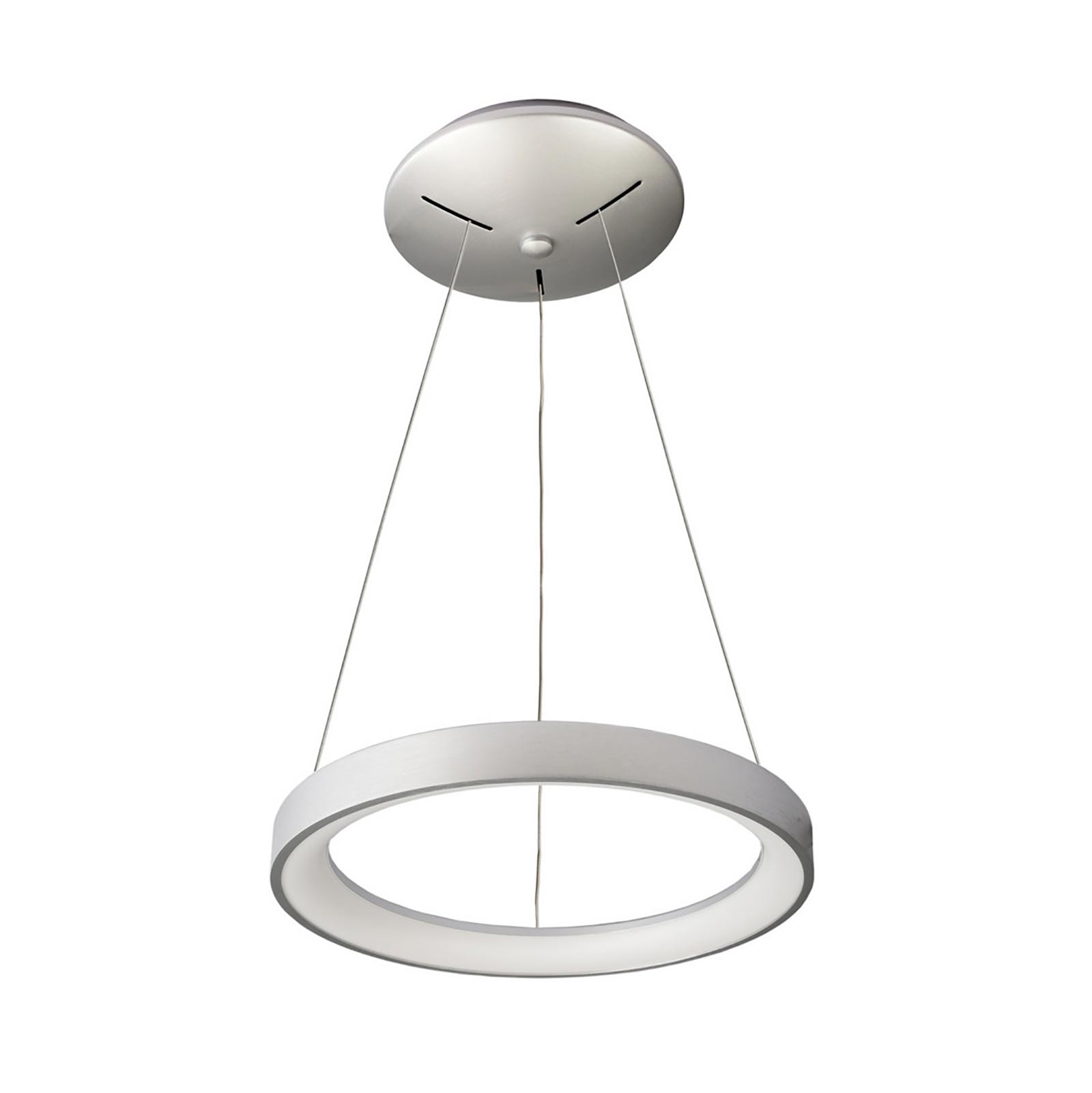 MEROPE 400 Lampadario dimmerabile moderno con 144 LED CCT integrati ad alta efficienza energetica con potenza 30W ideale per l'illuminazione e l'arredamento interno di cucine moderne, soggiorni, salotti, saloni, uffici, negozi per dare un tocco di originalità ad ambienti come pizzerie, ristoranti, sale da the, bar. La lampada ha una forma circolare ed è realizzata in alluminio di ottima qualità con rosetta coprifili sempre in alluminio dotata di 3 cavi in acciaio. Si alimenta a 230V direttamente alla rete elettrica.