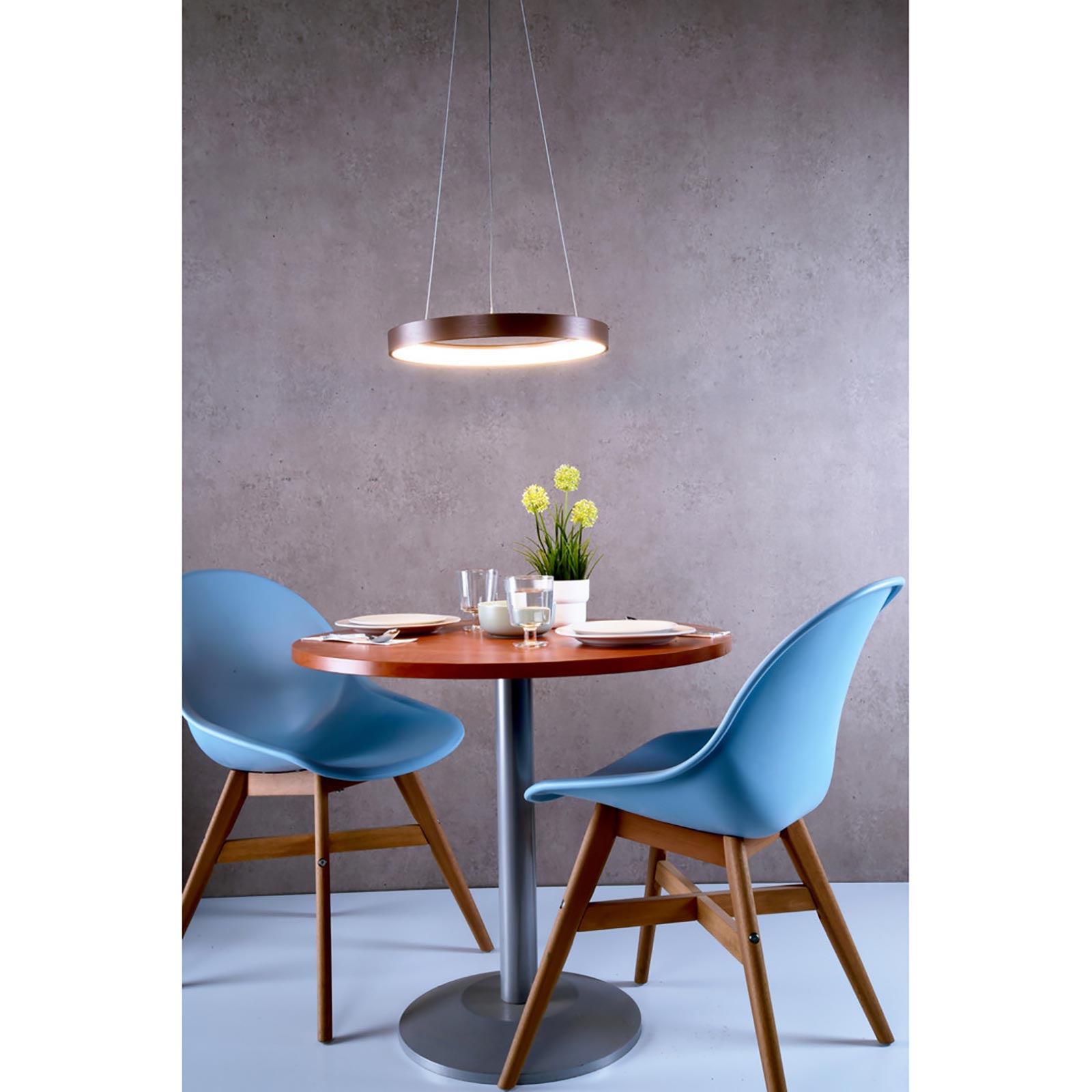MEROPE 400 Lampadario dimmerabile moderno con 144 LED CCT integrati ad alta efficienza energetica con potenza 30W ideale per l'illuminazione e l'arredamento interno di cucine moderne, soggiorni, salotti, saloni, uffici, negozi per dare un tocco di originalità ad ambienti come pizzerie, ristoranti, sale da the, bar. La lampada ha una forma circolare ed è realizzata in alluminio di ottima qualità con rosetta coprifili sempre in alluminio dotata di 3 cavi in acciaio. Si alimenta a 230V direttamente alla rete elettrica.