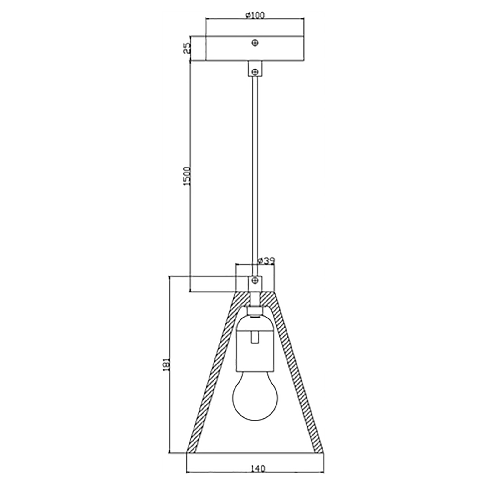 Lunghezza del pendente 181mm x 140mm - Diametro della rosetta: 100mm x 25mm di altezza. Lunghezza del cavo per la sospensione 1.5 metri.