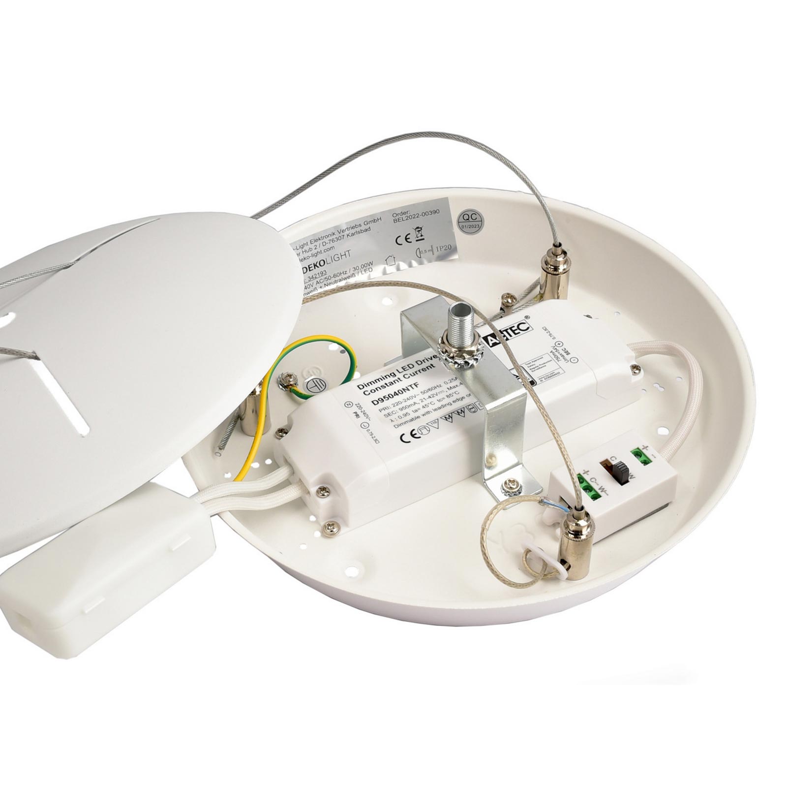 Dotato di rosetta copri fili in metallo, si alimenta a 230V con un grado di protezione IP20 ideale per uso interno. La dimensione massima della sospensione è di 1.8 metri. Inoltre la sospensione è regolabile in altezza.