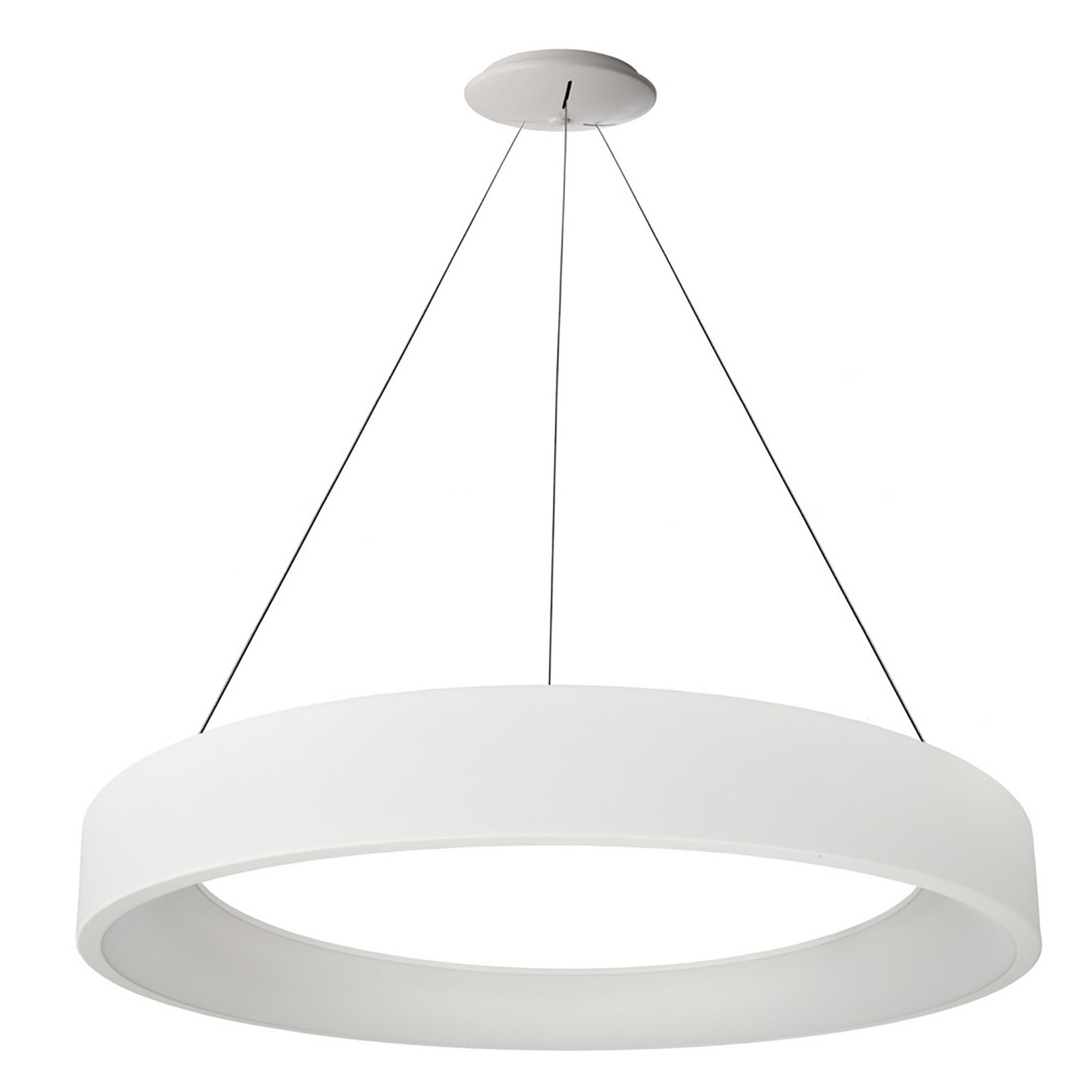SCULPTORIS 800 Lampadario moderno dimmerabile a forma di cerchio dotato di 3 corde in acciaio per la sospensione, integra 384 led ad alta luminosità con potenza di 60W. Realizzato in alluminio disponibile in 2 colori bianco e nero ha il diffusore opaco ed è dotato di pratico switch che consente di scegliere la temperatura di luce desiderata: 3000K luce calda e 4000K luce naturale. Ideale per l'illuminazione interna di ambienti moderni come cucine, salotti, camere da letto, soggiorni, negozi, uffici, attività commerciali, negozi, studi medici. Ideale per dare un tocco di originalità ai propri ambienti interni grazie anche all'ampio angolo di luce che illumina gli ambienti in modo ottimale sia verso l'alto che verso il basso.