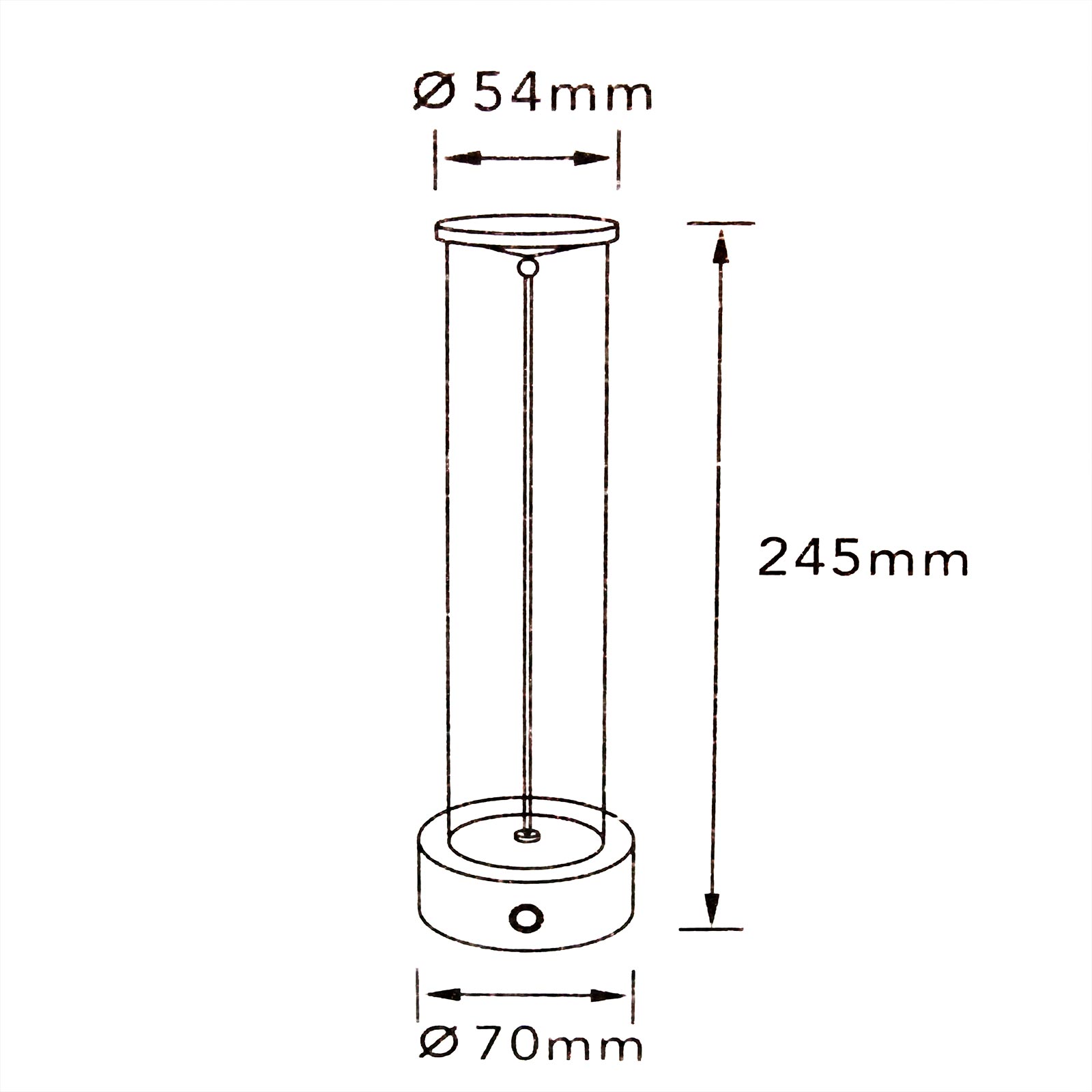 Dimensioni: Ø 70 mm base, Ø 54 mm parte superiore, altezza 245 mm.