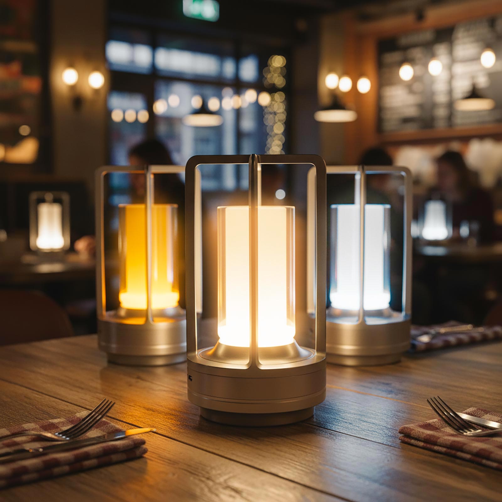 Lampada da tavolo ricaricabile senza fili, progettata per creare una piacevole luce d’atmosfera su tavoli e tavolini di bar, pub, ristoranti, pizzerie o in ambienti domestici come salotti, camere da letto e uffici.