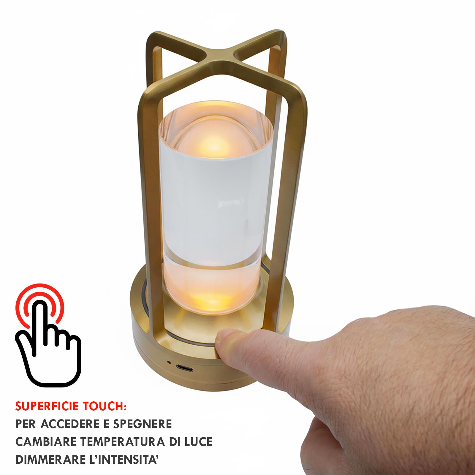 Disponibile in due finiture, oro e argento, si integra facilmente in contesti moderni o classici. Le dimensioni compatte di Ø 90 mm x altezza 180 mm la rendono adatta come luce atmosfera per tavoli o lampada per comodino e scrivania. Grazie alla combinazione di materiali di qualità, il controllo touch e l'autonomia prolungata, rappresenta una soluzione pratica per l’illuminazione decorativa di ambienti privati e professionali.