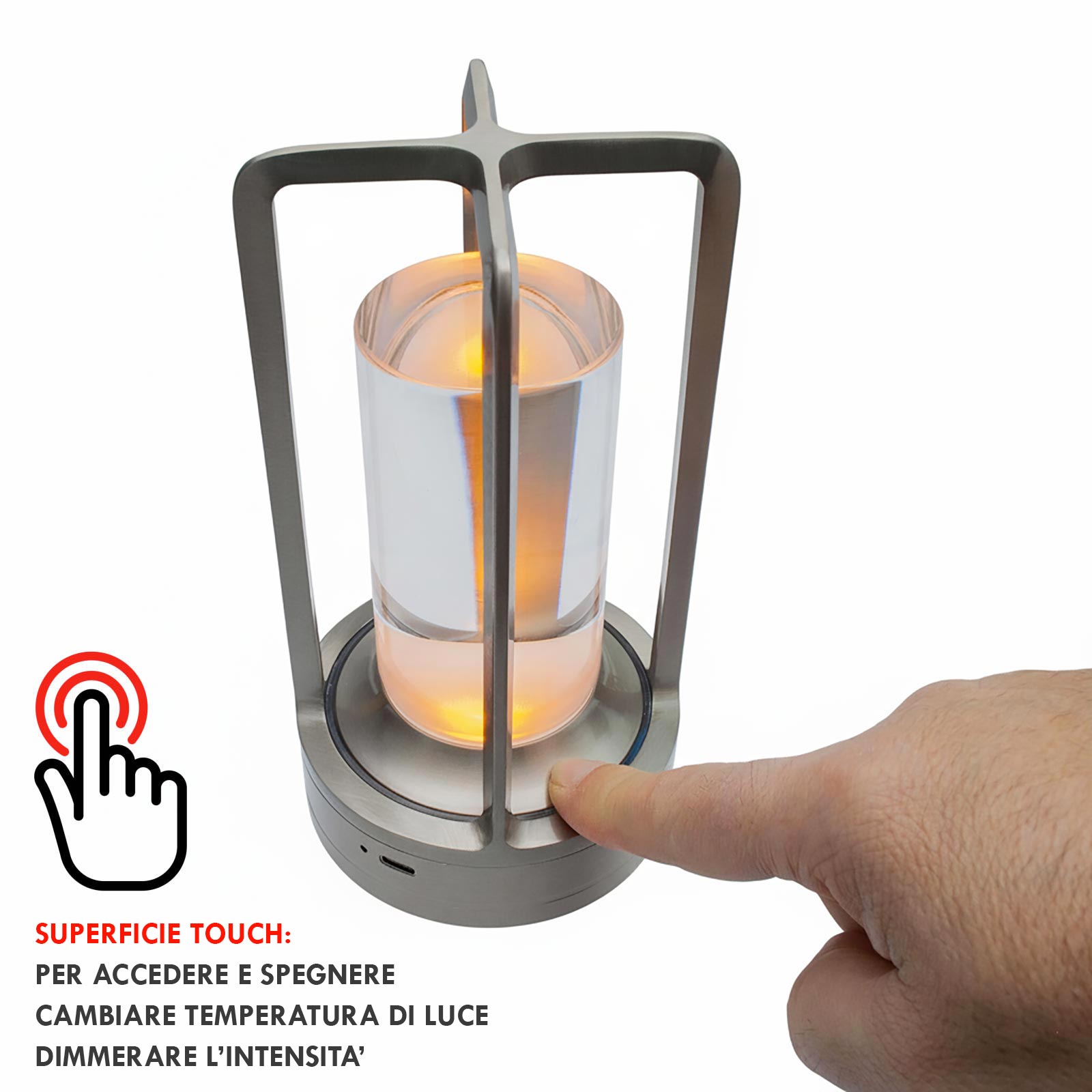 Lampada da tavolo ricaricabile senza fili, progettata per creare una piacevole luce d’atmosfera su tavoli e tavolini di bar, pub, ristoranti, pizzerie o in ambienti domestici come salotti, camere da letto e uffici.